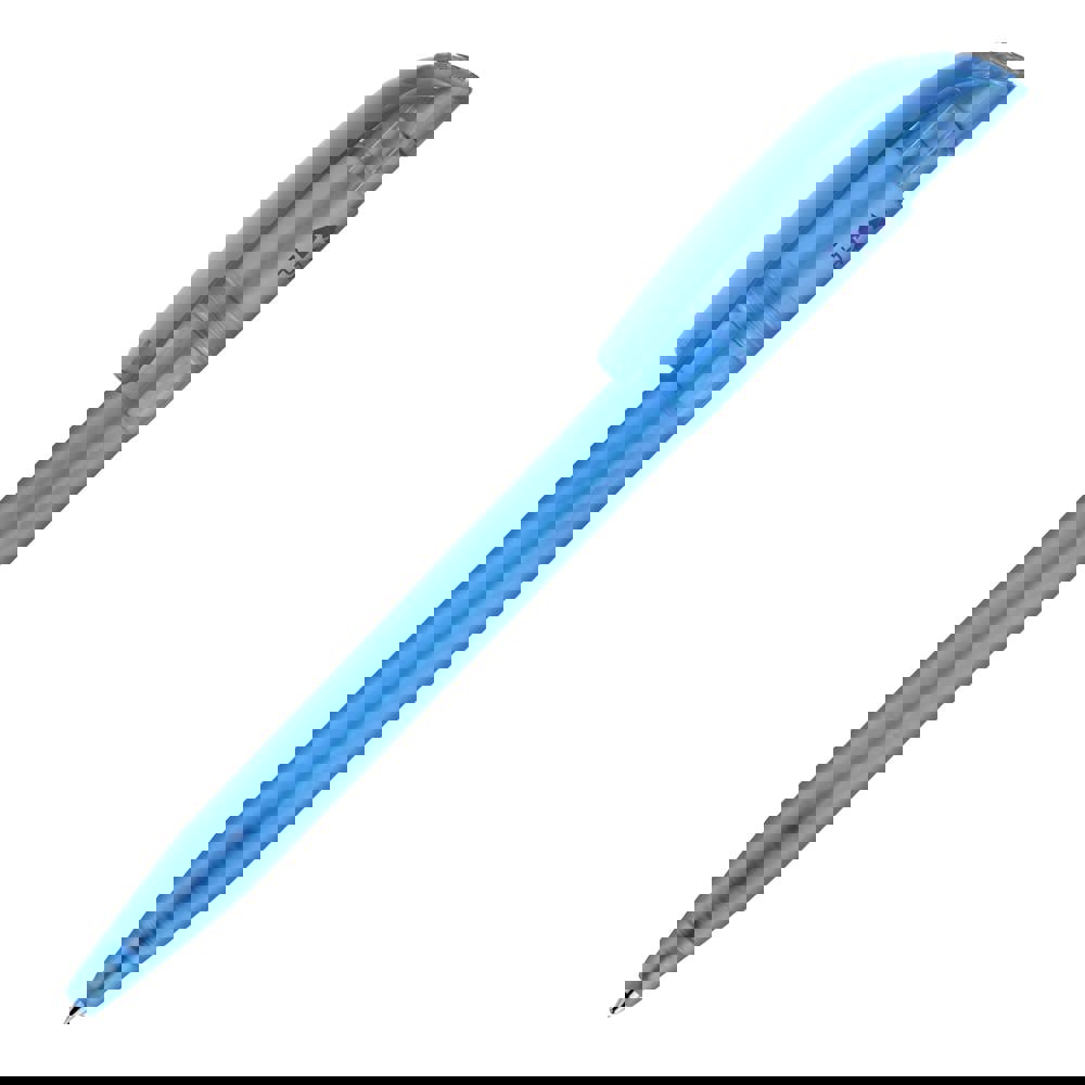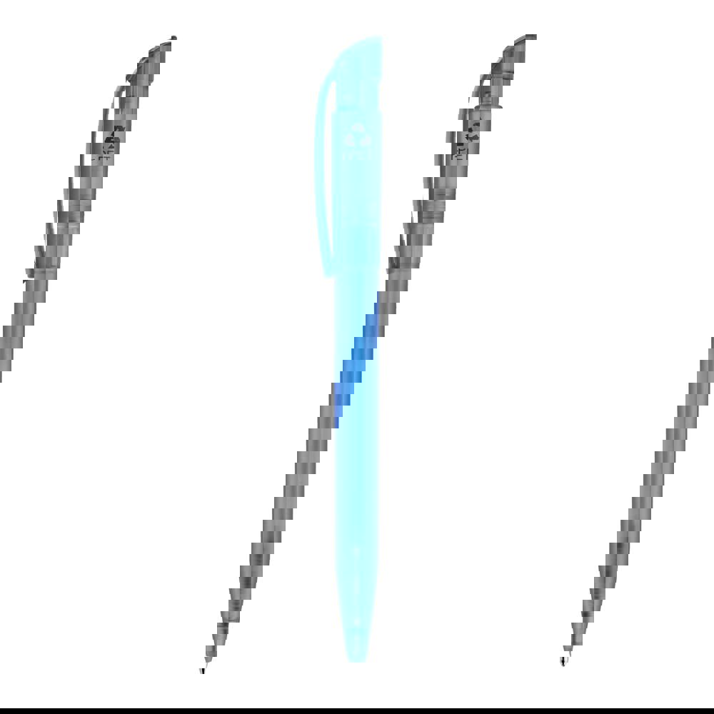 Stylo bille moderne avec clip courbé, fabriqué en R-PET (plastique recyclé). Avec une grande surface d'impression, c'est un bel objet publicitaire. Sa cartouche X20 écrit jusqu’à 2.5km, écriture par défaut bleue. Le stylo est fabriqué en Europe.