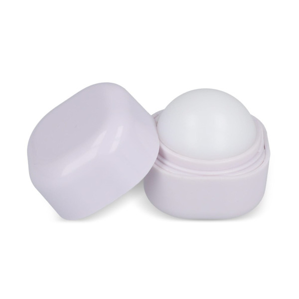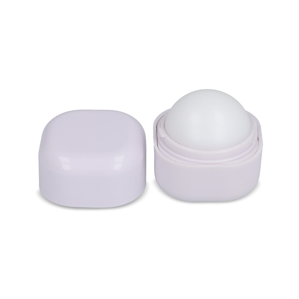 Baume à lèvres dans un contenant en forme de cube fabriqué à partir d'ABS recyclé. La forme arrondie de la bille à l'intérieur permet une application en douceur pour un soin hydratant.