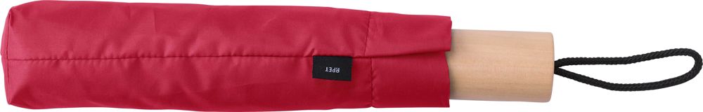 Parapluie pliable en polyester pongée 190T avec fermeture et ouverture manuelles, mât et baleines en métal, manche en bambou, livré avec une housse.