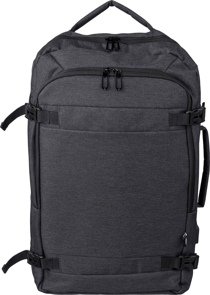 Sac à dos porte-ordinateur de 17''en polyester rPET 300D avec doublure intérieure 210D. Poignées sur le dessus et sur les côtés. Compartiment velcro pour ordinateur portable, poche antivol et deux grands compartiments zippés. Dos matelassé et ventilé, sangle trolley, boucles de fermeture et port USB-A sur le côté. Boucles latérales pour sécuriser le contenu. Poids ytansportable jusqu'à 12 kg. Comprend une étiquette rPET.