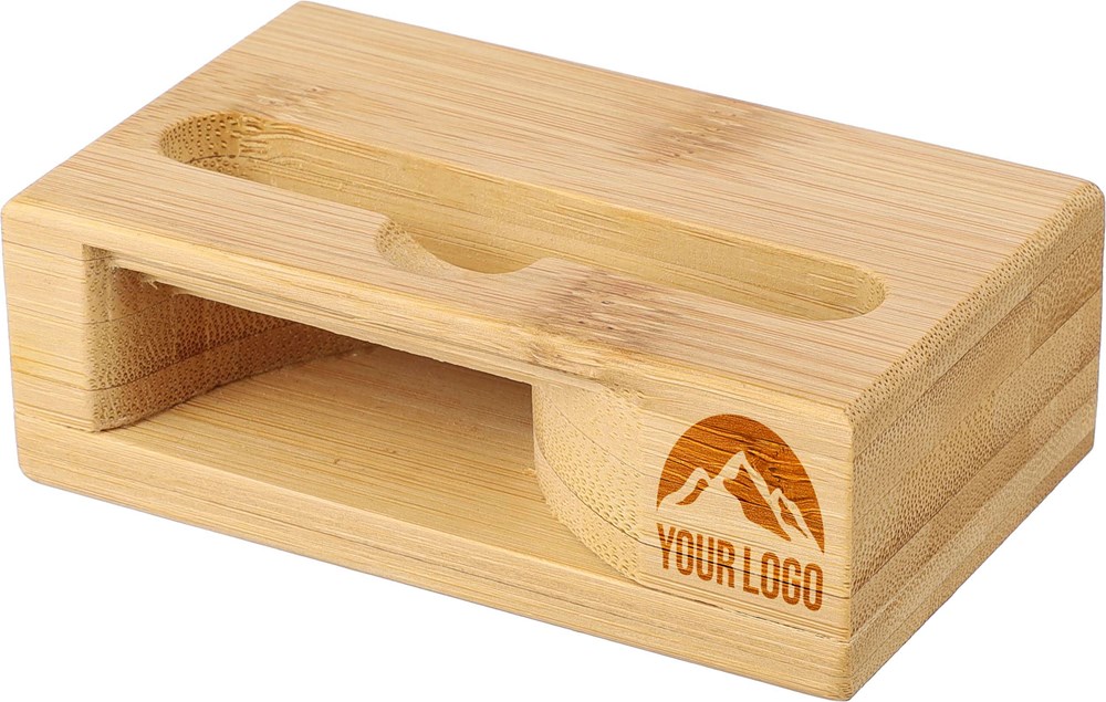Support de téléphone en bambou avec amplificateur de son acceptant des portables de 8,2 x 1,2 cm dans une boîte cadeau en kraft.