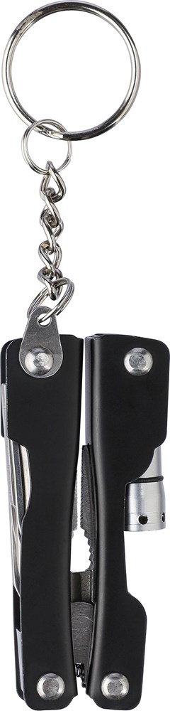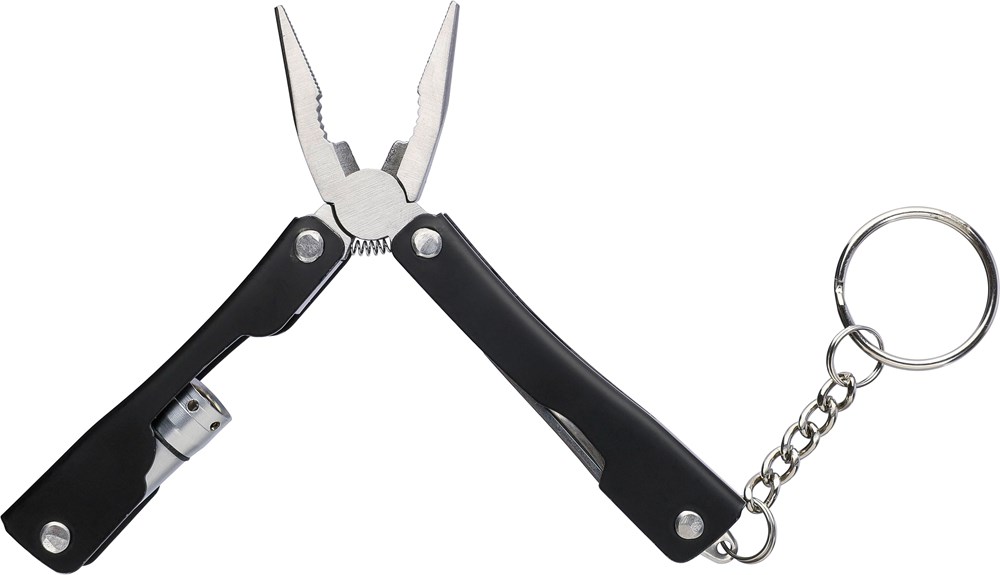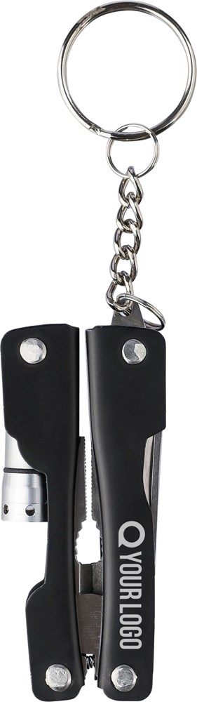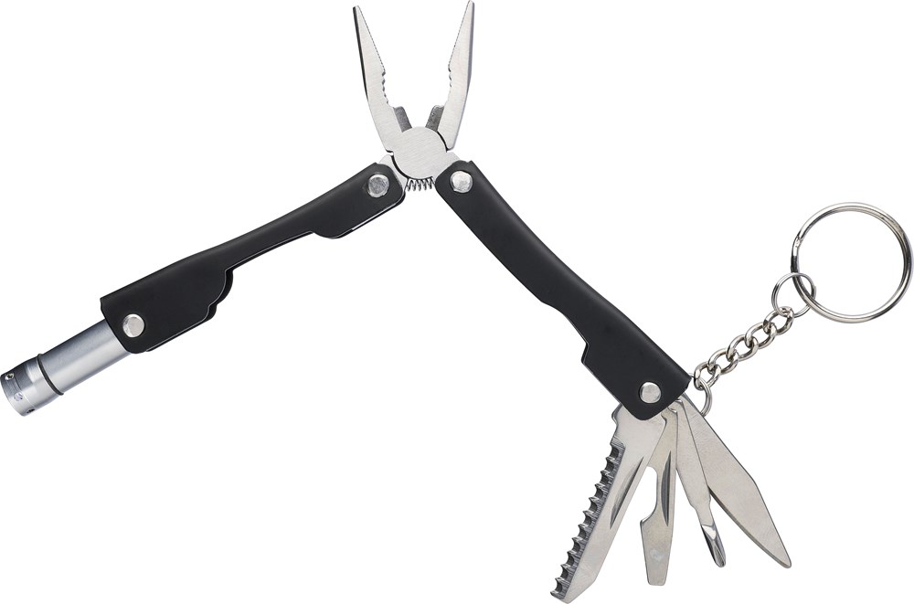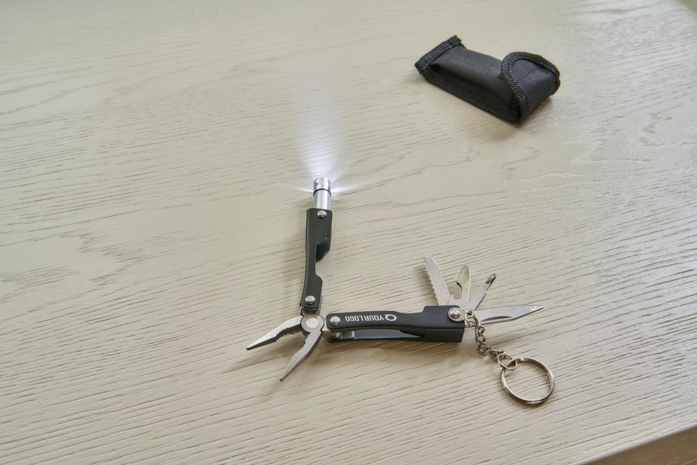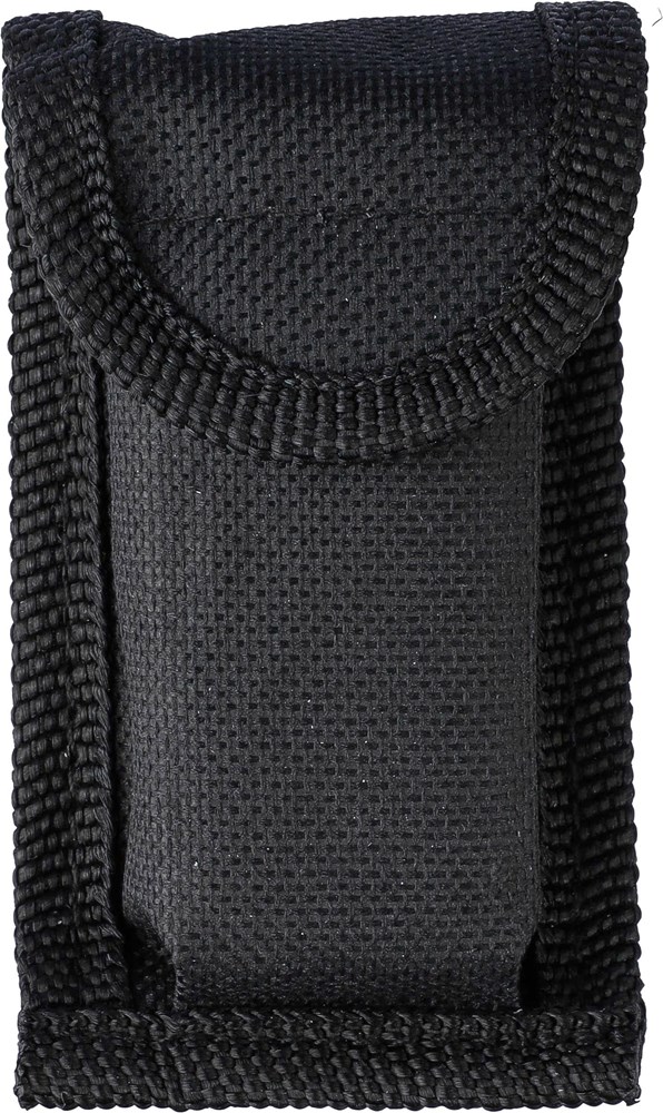 Outil multifonction pliable en acier inoxydable de 10 fonctions avec torche LED dans un étui en polyester 600D avec fermeture velcro et passant pour la ceinture dans une boîte cadeau en kraft.