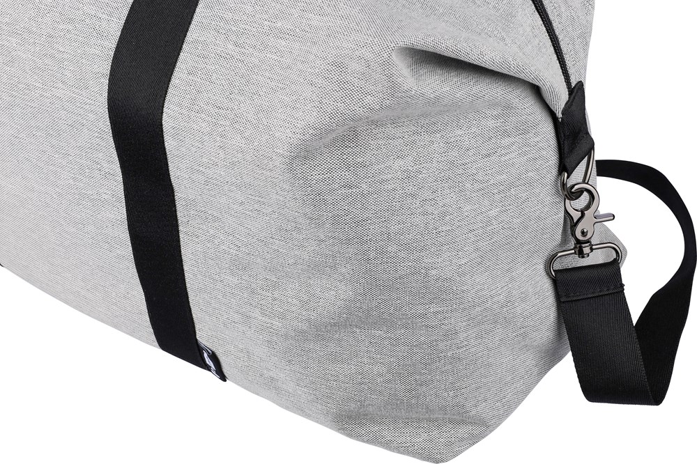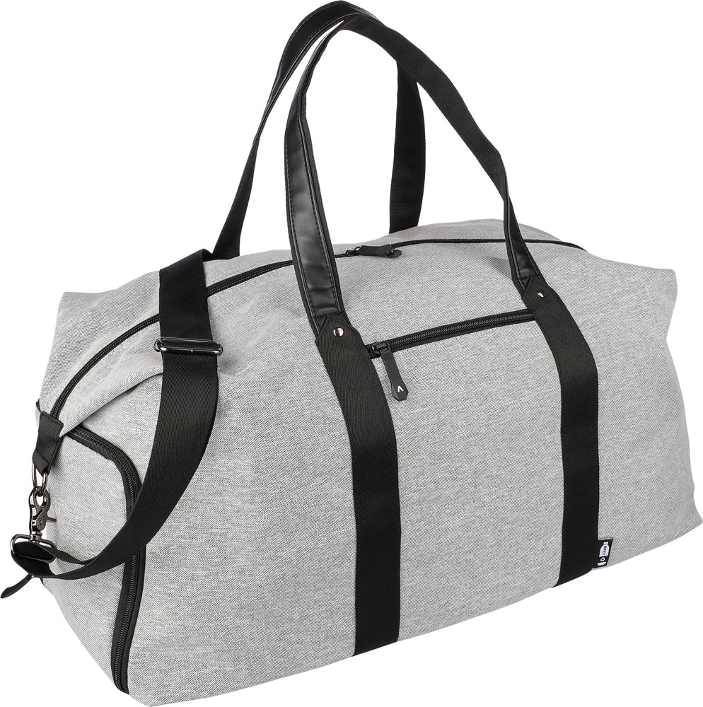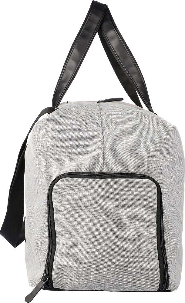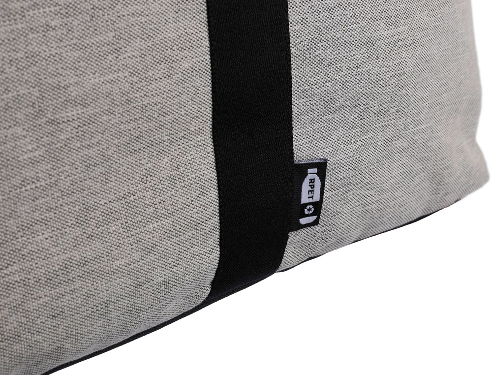 Sac de sport en polyester recyclé 600D avec doublure en PU 150D et rembourage de 4 mm et panneau en PE de 1 mm et attributs en PU avec poche zippée frontale, un grand compartiment et un compartiment à chaussures sur le côté et bandoulière réglable..
