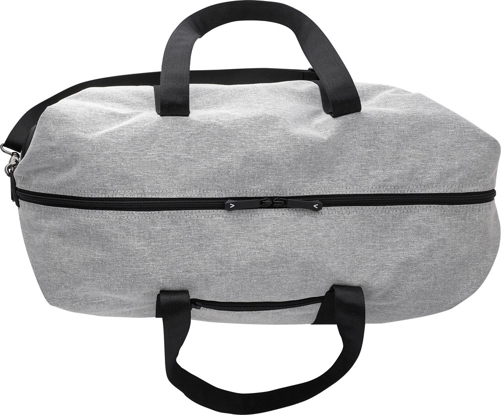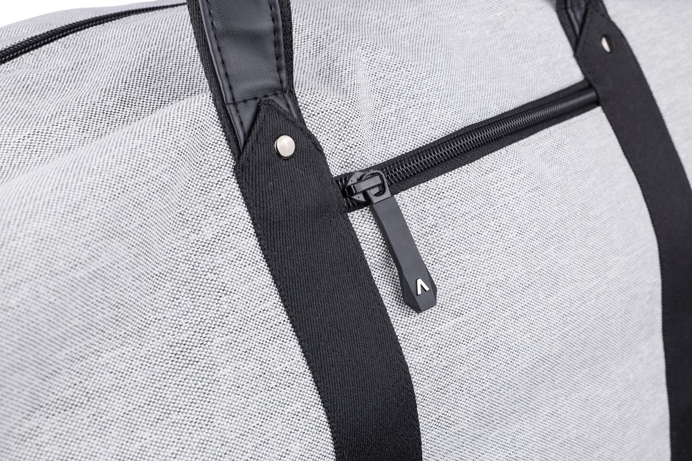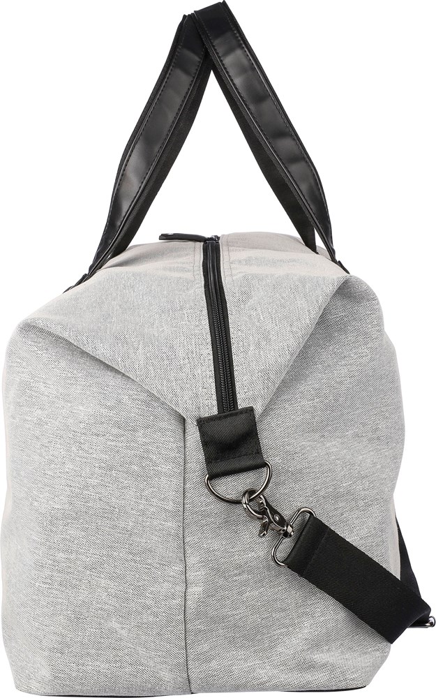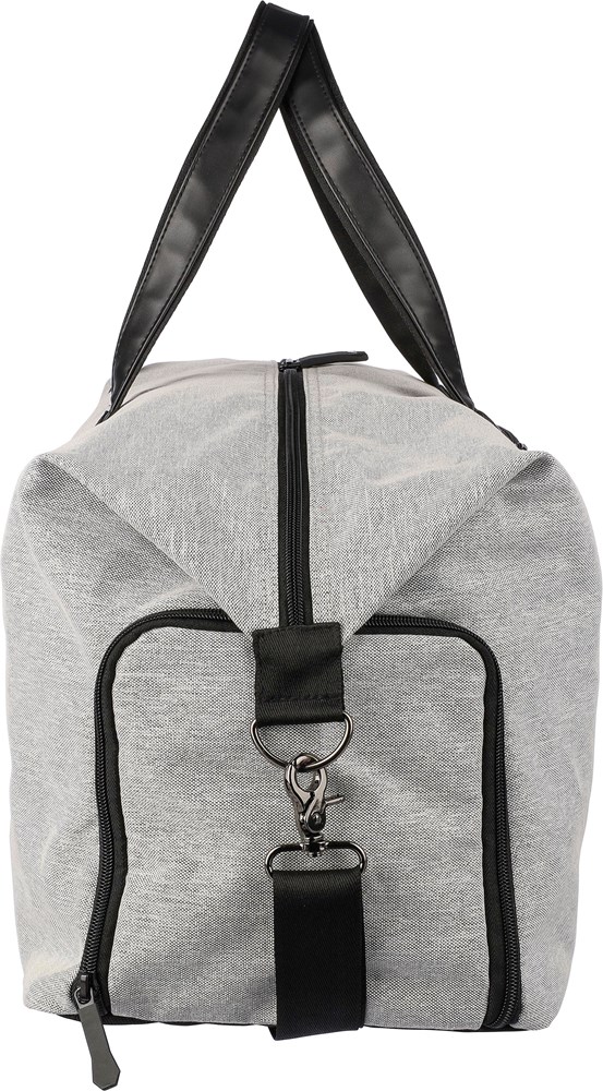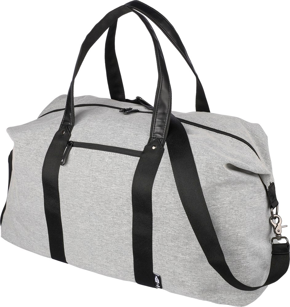 Sac de sport en polyester recyclé 600D avec doublure en PU 150D et rembourage de 4 mm et panneau en PE de 1 mm et attributs en PU avec poche zippée frontale, un grand compartiment et un compartiment à chaussures sur le côté et bandoulière réglable..