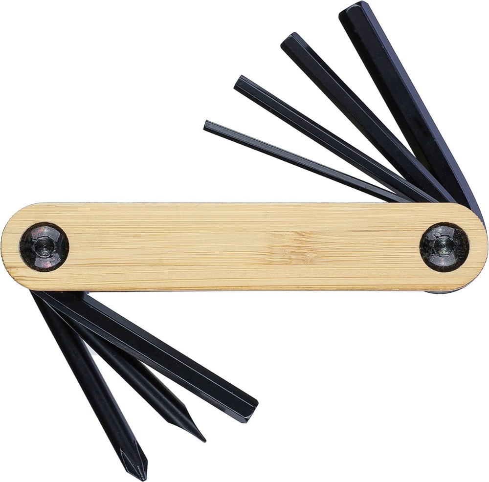 Outil multifonction en métal et bambou contenant un ensemble de 7 clés Allen, des tournevis cruciformes et des plats.