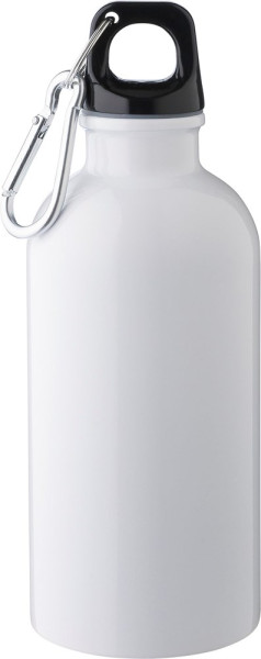 Gourde simple paroi en acier inoxydable recyclé (s/s304) d’une capacité de 400 ml, couvercle en PP et mousqueton en aluminium argenté.