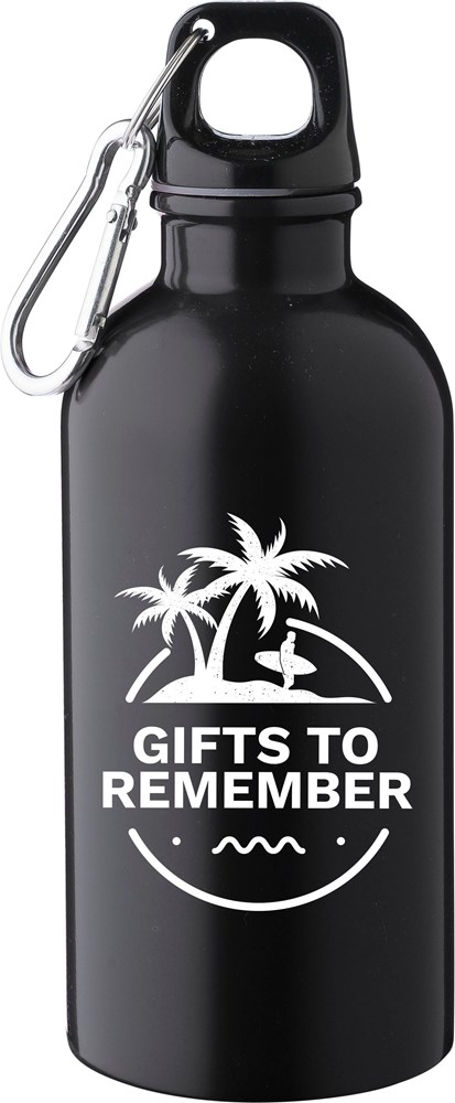 Gourde simple paroi en acier inoxydable recyclé (s/s304) d’une capacité de 400 ml, couvercle en PP et mousqueton en aluminium argenté.