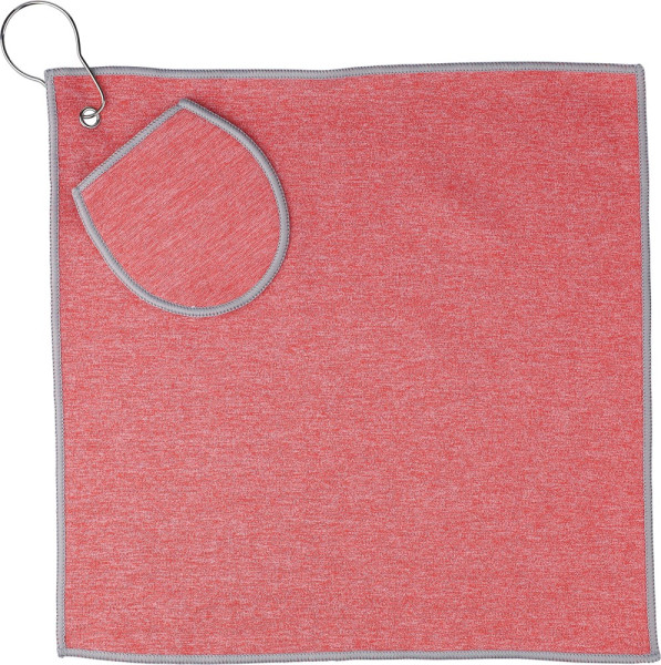 Serviette de golf en rPET avec pochette pour balles de golf intégrée, d’une dimension de 31 x 31 cm avec crochet en métal.