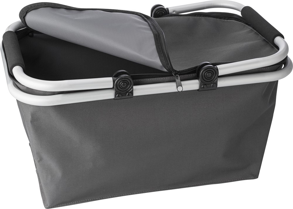 Panier pliable en polyester 600D avec cadre et poignées en aluminium.