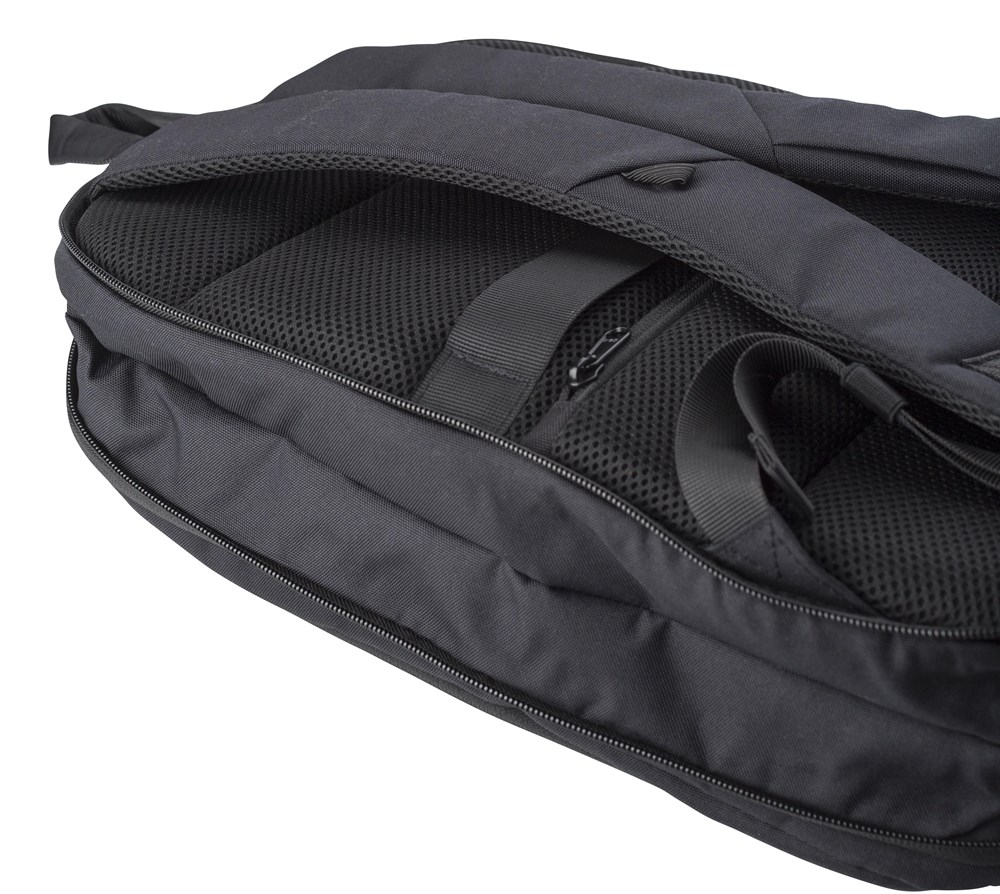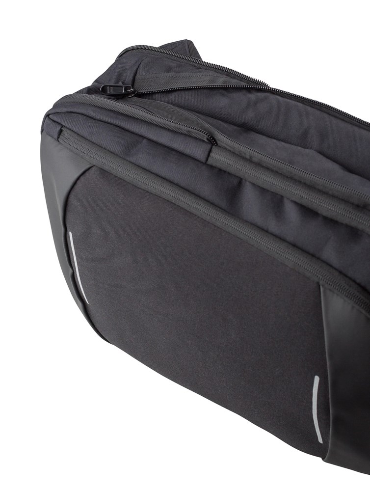 Sac à dos porte-ordinateur antivol de 15'' en polyester 600D muni de bandes réfléchissantes avec poche frontale et poche dorsale zippées.