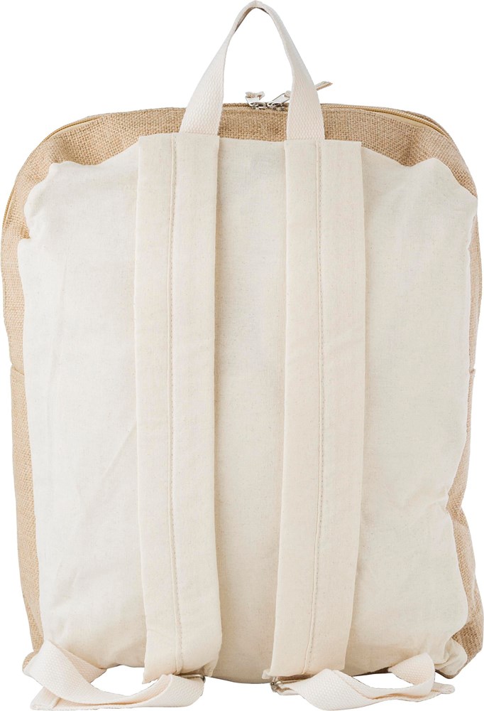 Sac à dos en jute et coton avec poche frontale zippée.