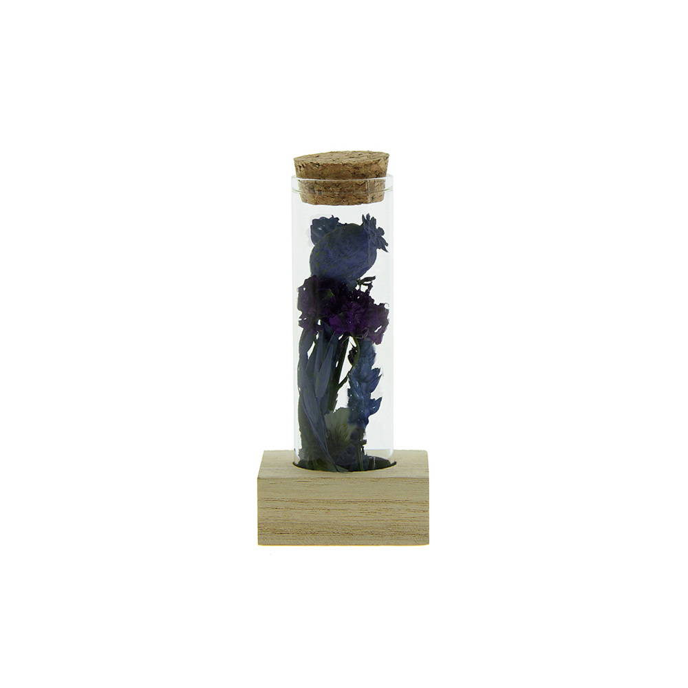 Un cadeau compact et élégant qui marque les esprits : cette version contient un tube en verre rempli de fleurs séchées durables dans les couleurs de votre identité visuelle. Le tube repose sur un socle en bois personnalisable avec un logo, un nom ou un court message.