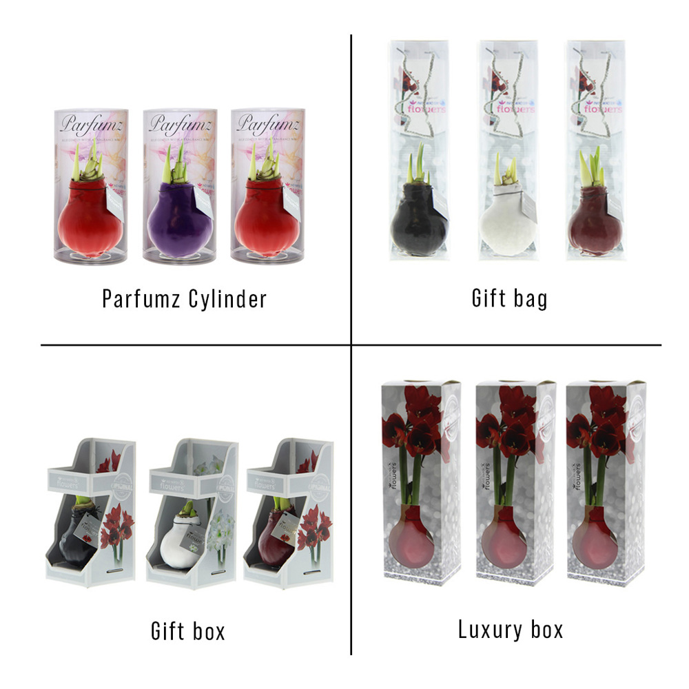Les No Water Flowers® Parfumz sont un cadeau parfumé, croissant et fleurissant. La couche de cire parfumée des No Water Flowers® Parfumz diffuse un parfum délicieux qui embellit votre maison à la fois visuellement et aromatiquement. Ils sont disponibles en parfum de lavande (violet) et en parfum de cerise (rouge). Ces No Water Flowers® vivants sont connus pour leurs bulbes d'amaryllis cirés faits à la main et uniques. Ces bulbes d'amaryllis spécialement sélectionnés et testés ont suffisamment d'énergie pour pousser et fleurir sans eau. Les véritables No Water Flowers® produisent des tiges florales courtes, ne se renversent pas et fleurissent à coup sûr. Chaque No Water Flowers® est soigneusement nettoyé et ciré à la perfection, donnant au bulbe une apparence contemporaine et à la mode.