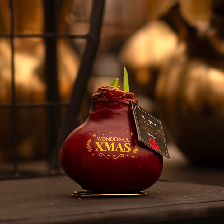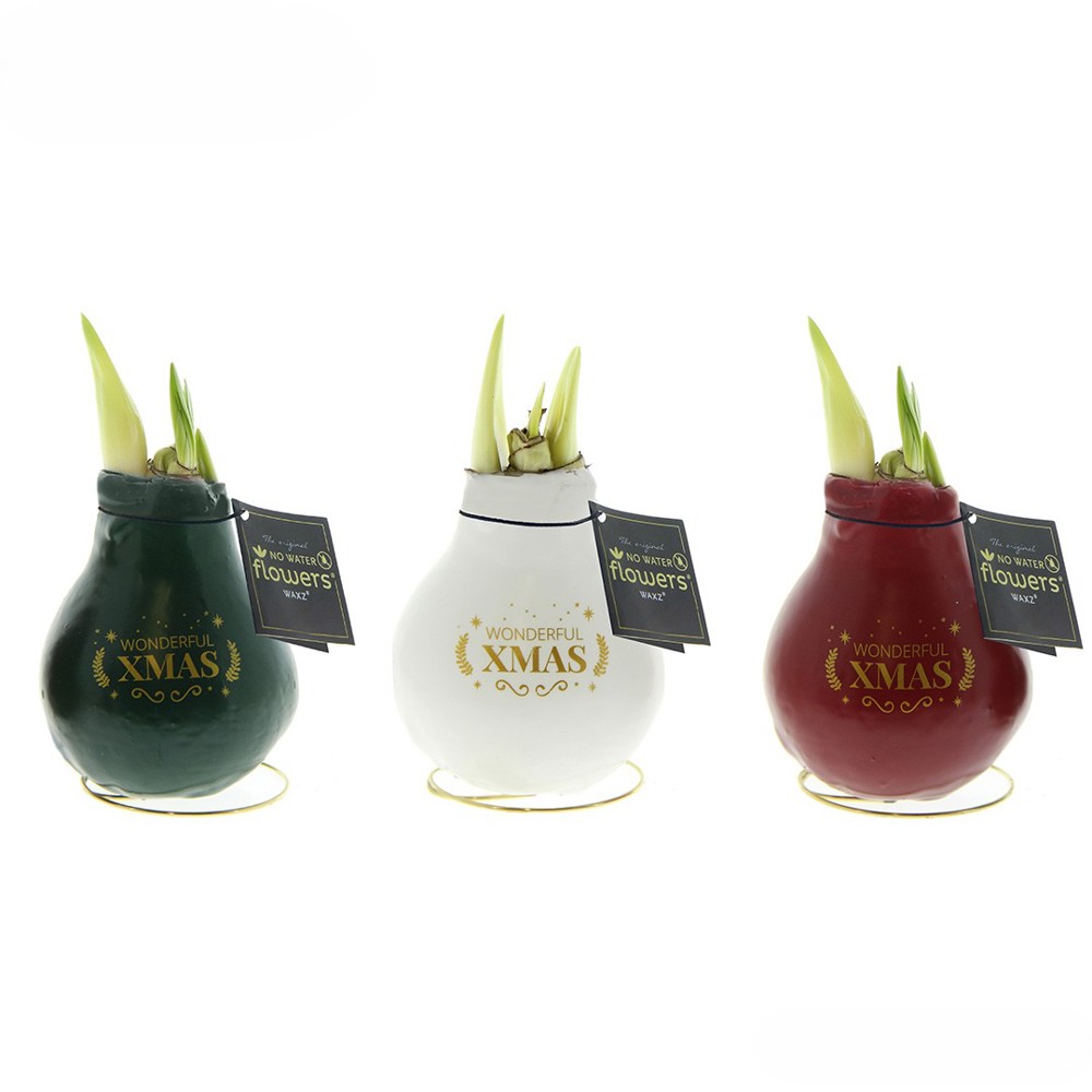 Le No Water Flowers® Printz Wonderful Xmas est un cadeau festif et raffiné aux couleurs classiques de Noël, parfait comme présent de fin d’année. Ces No Water Flowers® sont connus pour leurs bulbes d’amaryllis uniques, faits main et recouverts de cire. Sélectionnés et testés avec soin, ces bulbes contiennent suffisamment d’énergie pour pousser et fleurir sans eau. Les véritables No Water Flowers® produisent des tiges plutôt courtes, restent bien stables et fleurissent à coup sûr. Chaque bulbe est soigneusement nettoyé et ciré à la perfection, ce qui lui donne un aspect moderne et élégant.