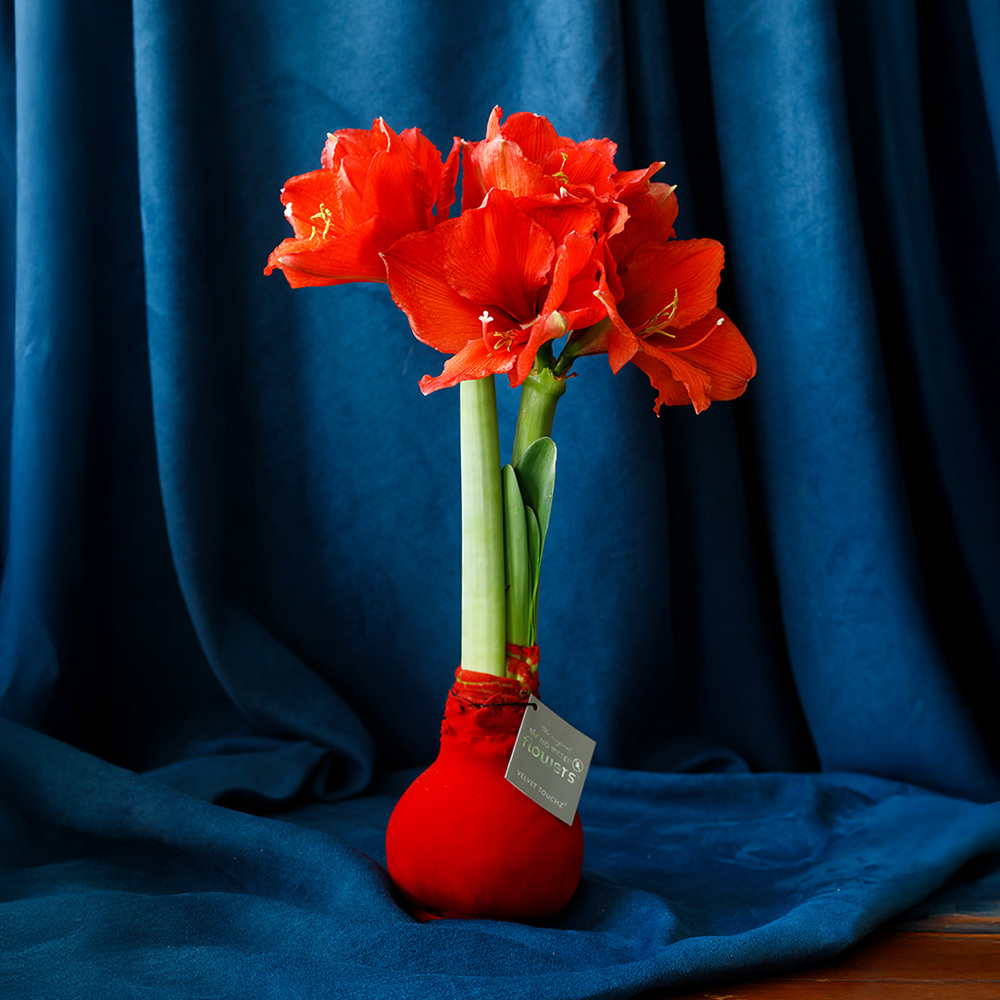 Les No Water Flowers® sont un cadeau luxueux, en pleine croissance et en floraison. Cette variante No Water Flowers Velvet Touchz® présente une finition velours, qui donne au bulbe une sensation douce et une apparence luxueuse. Ces bulbes d'Amaryllis spécialement sélectionnés et testés ont suffisamment d'énergie pour pousser et fleurir sans eau. Les authentiques No Water Flowers® produisent des tiges florales assez courtes, ne tombent pas et fleurissent de manière garantie. Chaque No Water Flowers® est soigneusement nettoyé et ciré à la perfection, ce qui confère au bulbe une apparence contemporaine et élégante.