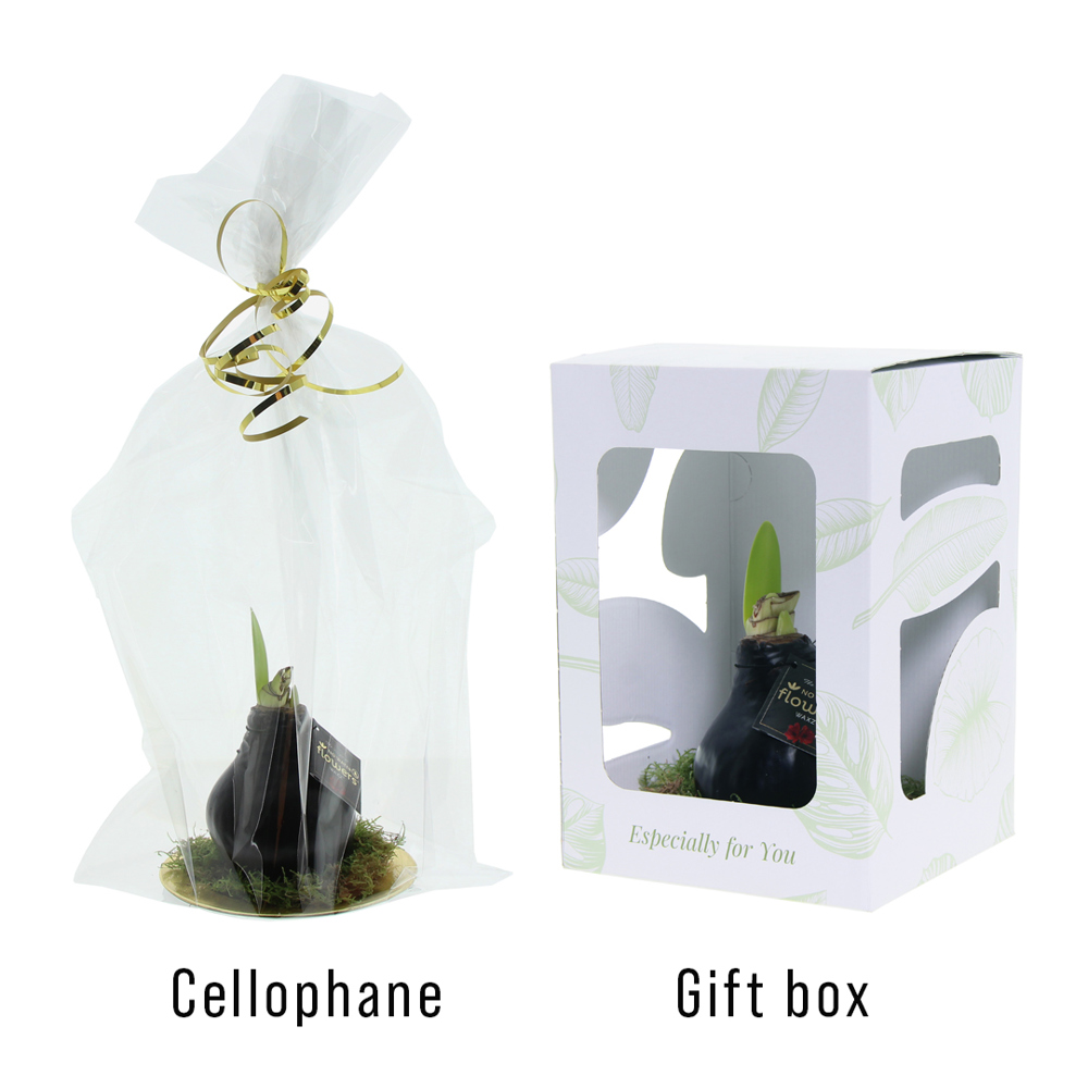 Les No Water Flowers® originales sont facilement reconnaissables grâce à l'étiquette carrée attachée au bulbe. Ces bulbes d'Amaryllis ne nécessitent aucun soin particulier. Placez l'Amaryllis en cire dans un endroit lumineux, mais pas en plein soleil, et profitez des magnifiques fleurs qui se développeront en 3 à 5 semaines. Les bulbes de fleurs sont des produits naturels, chaque bulbe est unique en soi et a une forme différente.