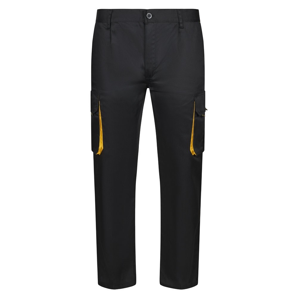 Pantalon bicolore multipoches en sergé (200g/m²), en coton (35%) et polyester (65%). Taille élastiquée et couleur contrastée sur les soufflets, les tirettes et les coutures. Contient six poches : (2 poches françaises, 2 poches à soufflet latérales et 2 poches à soufflet arrière). Taille: 34, 36, 38, 40, 42, 44, 46, 48, 50, 52, 54, 56, 58, 60