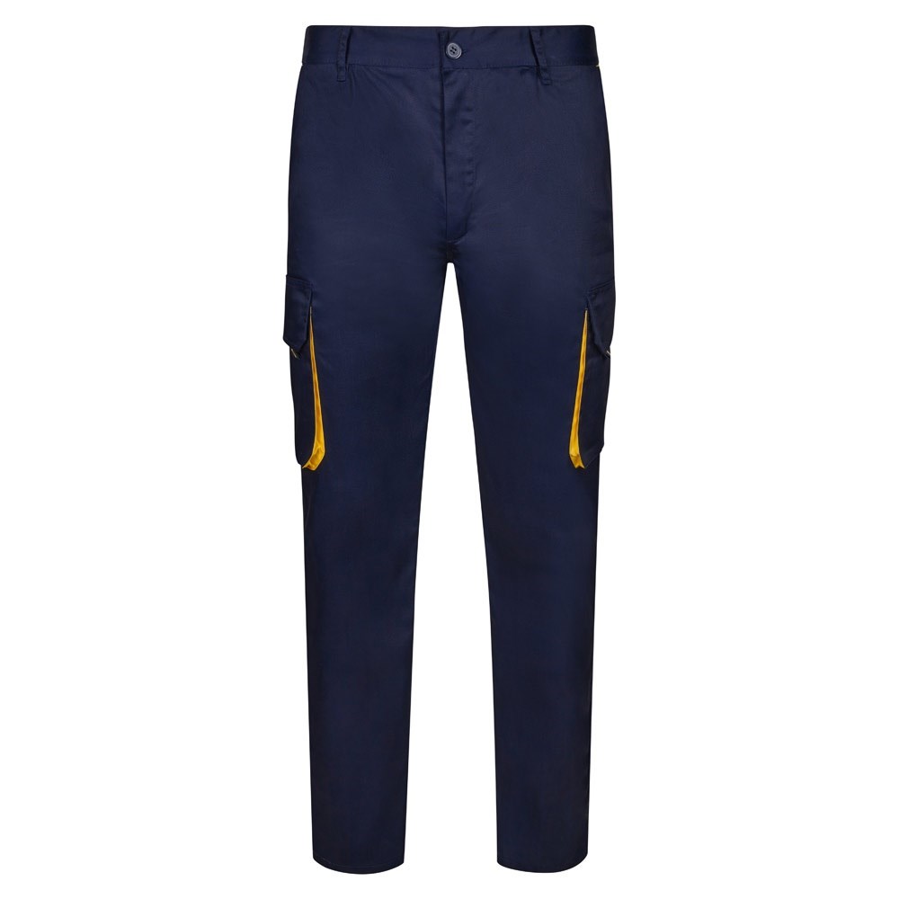 Pantalon bicolore multipoches en sergé (200g/m²), en coton (35%) et polyester (65%). Taille élastiquée et couleur contrastée sur les soufflets, les tirettes et les coutures. Contient six poches : (2 poches françaises, 2 poches à soufflet latérales et 2 poches à soufflet arrière). Taille: 34, 36, 38, 40, 42, 44, 46, 48, 50, 52, 54, 56, 58, 60