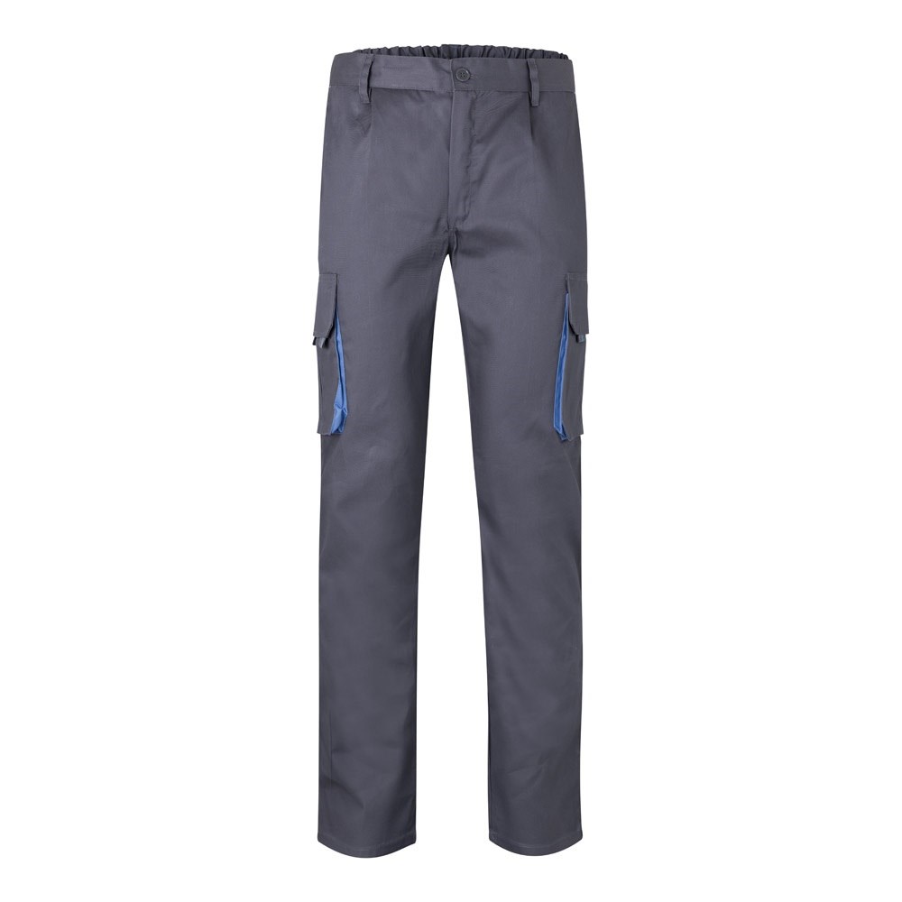 Pantalon bicolore multipoches en sergé (200g/m²), en coton (35%) et polyester (65%). Taille élastiquée et couleur contrastée sur les soufflets, les tirettes et les coutures. Contient six poches : (2 poches françaises, 2 poches à soufflet latérales et 2 poches à soufflet arrière). Taille: 34, 36, 38, 40, 42, 44, 46, 48, 50, 52, 54, 56, 58, 60
