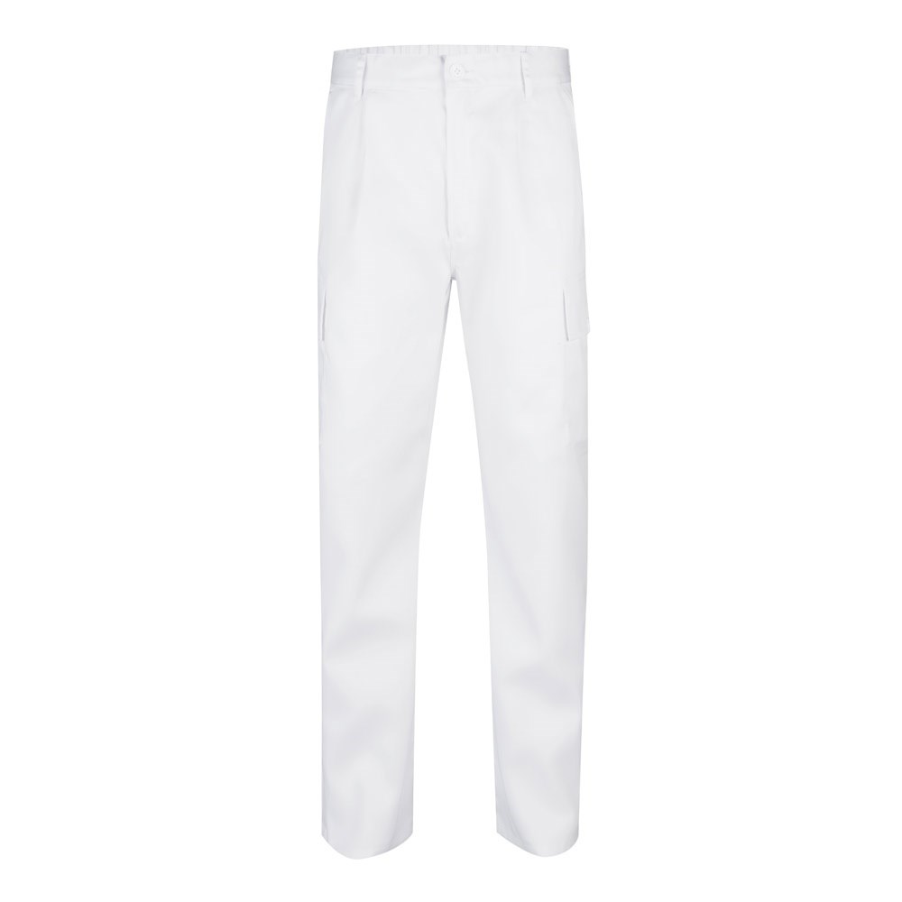 Pantalon multipoches en sergé (190g/m²), en coton (20%) et polyester (80%). Avec ceinture élastiquée et cinq poches (2 poches françaises, 2 poches à soufflet latérales et 2 poches à soufflet arrière). Taille: 36, 38, 40, 42, 44, 46, 48, 50, 52, 54, 56, 58, 60