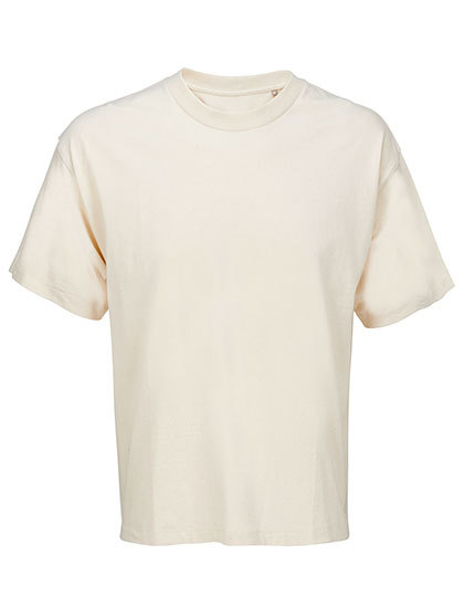 50 % coton recyclé / 50 % coton | Jersey 220 | Col en tricot côtelé 1x1 | Confection tubulaire | Coupe oversize | Épaules tombantes | Bande renforcée sur la nuque et les épaules