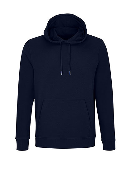 Coton brossé biologique en conversion | Polyester recyclé | Coupé et cousu | Manches montées | Côte 2x2 aux poignets et au bas du vêtement | Poche kangourou devant | Demi-lune en jersey et bande de propreté à l'intérieur du col | Doublure capuche jersey | Cordon avec œillets et stoppeurs en métal | Intérieur non brossé