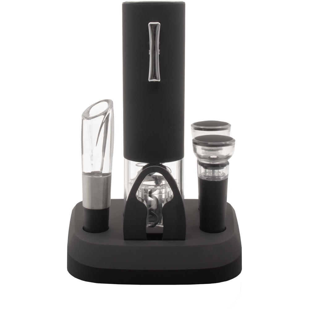 Geniet van een perfecte combinatie van wijn en technologie met dit alles-in-één elektrische wijnset. De meegeleverde foliesnijder past netjes over de hals van de fles voor een schone, moeiteloze snede. De volledig automatische kurkentrekker verwijdert de kurk in seconden en stopt automatisch zodra de extractie voltooid is, terwijl een tweede knop de kurk voorzichtig loslaat. Het set bevat ook een schenktuit met ingebouwde beluchter om de smaak van de wijn te verbeteren tijdens het serveren. Om je wijn te bewaren, gebruik de vacuümstopper om lucht te verwijderen en de versheid te behouden – plaats hem stevig in de fles en pomp totdat weerstand wordt gevoeld. Laad de basis volledig op gedurende 12 uur vóór het eerste gebruik. Kan worden aangepast met lasergravure met een metallic-effect. Wordt geleverd in een gerecycleerde kartonnen geschenkverpakking.