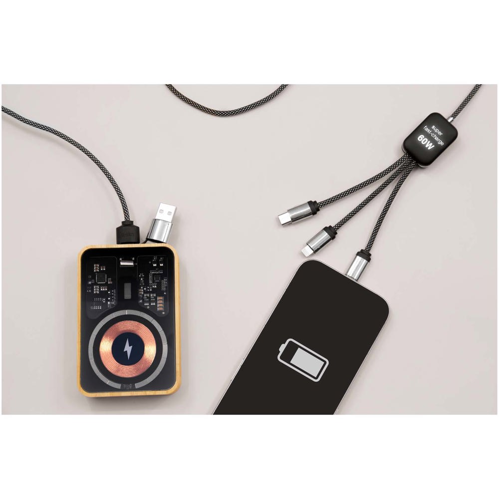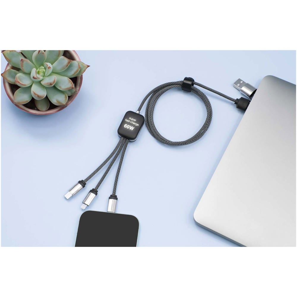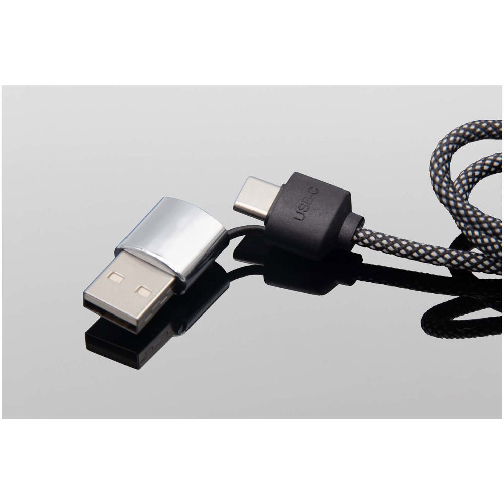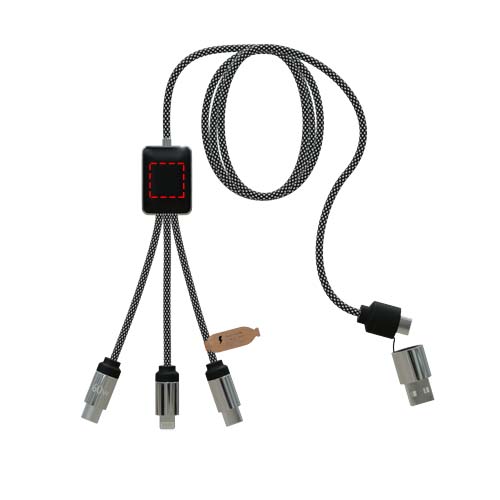 Deze 1-meter 60W-oplaadkabel heeft een stijlvolle rubber- en metalen afwerking, snoeren gemaakt van gerecyclede plastic flessen en dubbele verlichte logo’s – elk aanpasbaar en optioneel verschillend. Voorzien van drie connectoren (2 × Type-C en 1 × Lightning) kan hij twee of drie apparaten tegelijk opladen. De dubbele USB-A- en USB-C-ingang zorgt voor volledige compatibiliteit met de nieuwste computers, inclusief USB-C-modellen. De kabel biedt dubbelzijdige personalisatie en wordt geleverd in een recyclebare TPU-sleeve met een gerecycled papieren achterkaart.