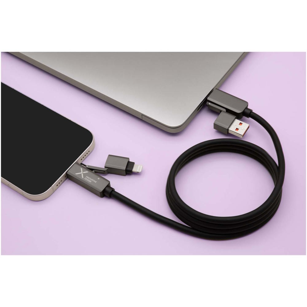 Ultrasnelle 100W magnetische oplaadkabel die smartphones, tablets en laptops van stroom voorziet. De 1-meter platte kabel heeft Type-C- en Lightning-connectoren, snoeren gemaakt van gerecycled silicone en duurzame eindkappen van zinklegering. Met dubbele USB-A- en USB-C-ingang is hij 100% compatibel met de nieuwste computermodellen. Volledig compatibel met Apple CarPlay en Android Auto. Personalisatie is mogelijk via lasergravure op de zinken eindkap. Wordt geleverd in een recyclebare TPU-zak met een gerecycled papierinzet.