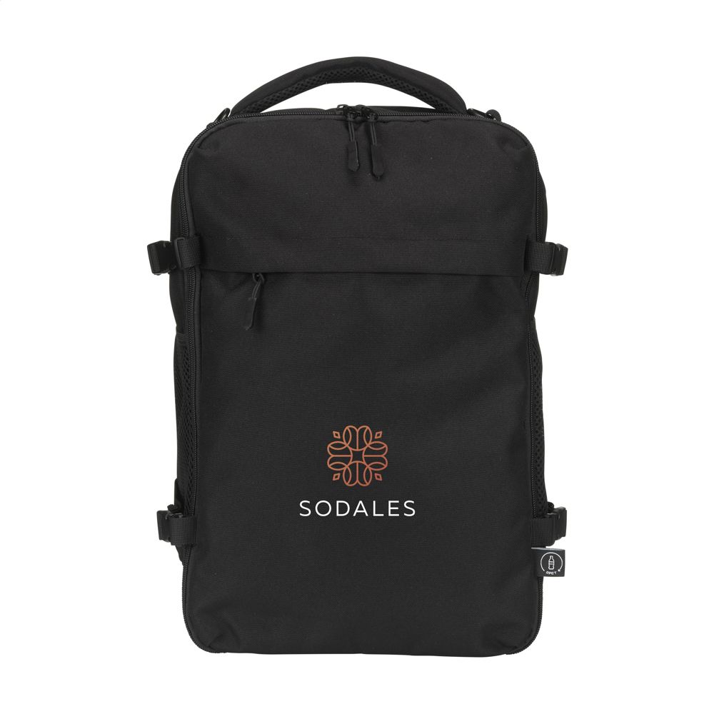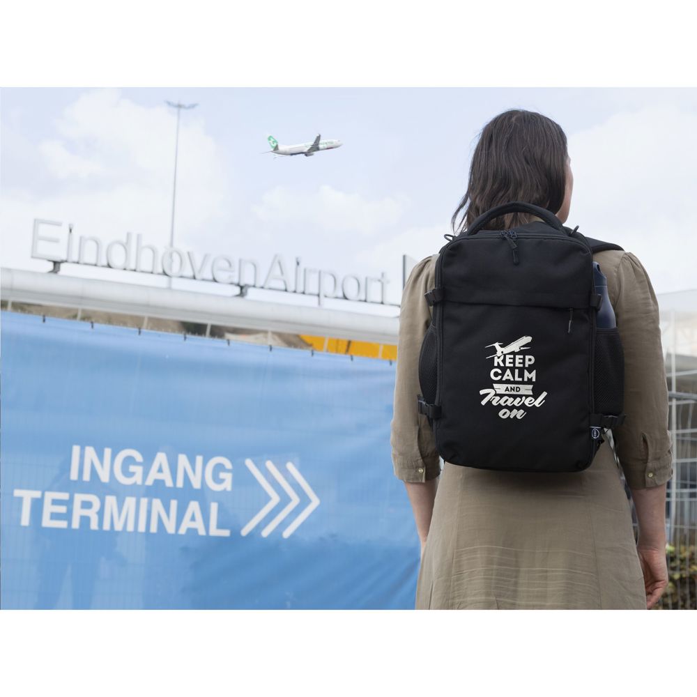Ce sac à dos Cabin Flight compact et polyvalent est conçu pour être emporté comme bagage à main dans l'avion par toutes les compagnies aériennes. Il se glisse facilement sous le siège de n'importe quel avion. Avec une capacité d'env. 20 litres, ce sac à dos offre un espace de rangement étonnamment grand, tandis que son poids léger le rend confortable à porter. L'extérieur est fabriqué en polyester RPET 900D recyclé résistant. Entièrement doublé de polyester RPET 210D recyclé. Le compartiment principal spacieux, avec fermeture à glissière et double tirette, est idéal pour les vêtements et comprend un organiseur pratique pour le téléphone, les documents personnels et autres objets essentiels. Une poche rembourrée supplémentaire offre une protection sûre pour les ordinateurs portables jusqu'à 15,6 pouces. Le sac est doté de poches en filet élastiques des deux côtés, idéales pour une bouteille d'eau ou de petits accessoires. Le panneau arrière comporte une poche zippée supplémentaire. Les sangles sont fixées dans cette poche zippée dans la partie supérieure et attachées dans la partie inférieure à l'aide d'un mousqueton. En détachant les crochets, les sangles peuvent être entièrement rangées dans la poche zippée, ce qui rend le sac encore plus compact. Les sangles rembourrées et réglables, le panneau dorsal rembourré et la poignée solide avec doublure en maille assurent un confort optimal, même lors de longs trajets. Les sangles amovibles incluses. Une sangle de trolley intégrée permet de fixer facilement le sac à dos sur une valise. Ce sac à dos est le compagnon de voyage idéal pour tous vos déplacements en avion. Certifié GRS. Matière recyclée totale : 50%.