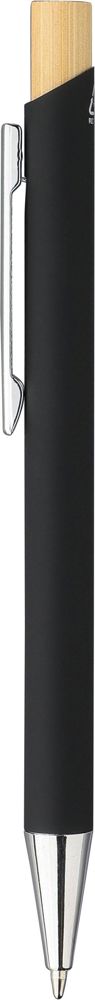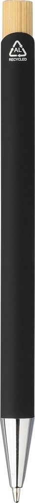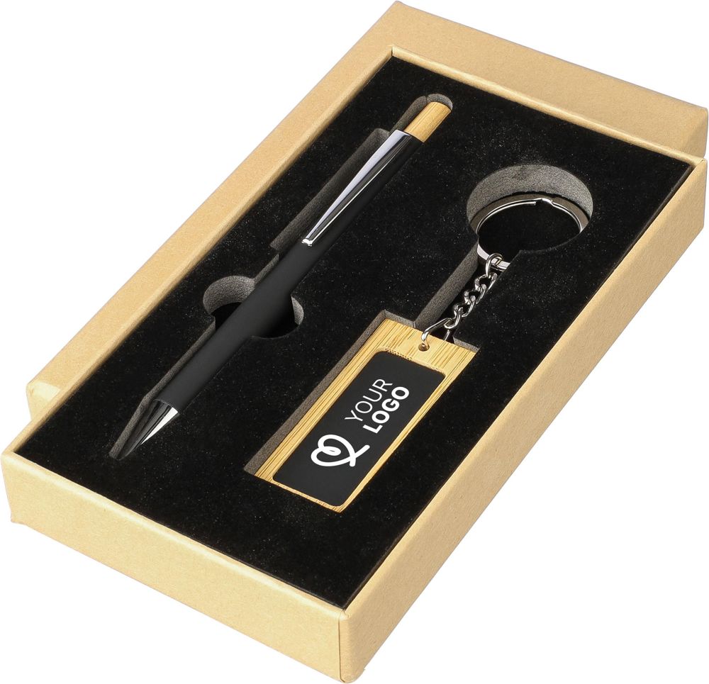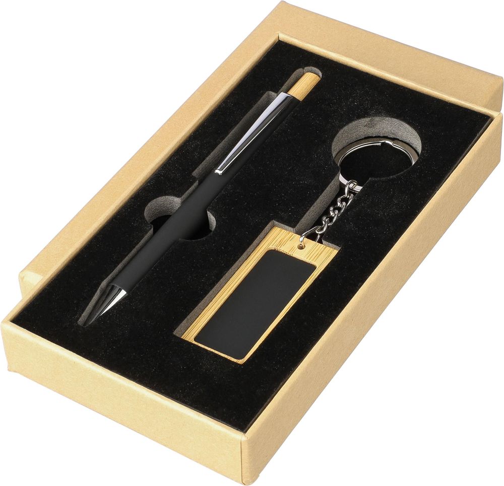 Coffret d'écriture en bambou composé d'un stylo à bille en bambou et aluminium recyclé toucher gomme, mine bleue. Il est doté d'un bouton-poussoir en bambou et d'une pointe en plastique chromé, ainsi que d'un porte-clés rectangulaire en bambou et acier inoxydable toucher gomme. Les deux articles révèlent un effet miroir après gravure laser et arborent un logo en aluminium recyclé. Présentés dans une boîte en kraft avec incrustation de suédine.