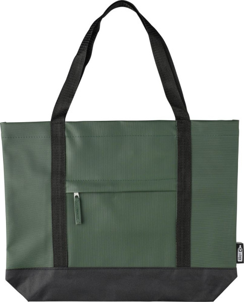 Sac shopping en polyester rPET 600D avec revêtement en PU sur les deux faces pour une meilleure imperméabilité. Il est doté d'une poche frontale zippée, d'une petite poche intérieure zippée et de longues anses. Sa capacité est de 10 litres et sa charge maximale de 10 kg. Il est doté d'une étiquette rPET et d'une étiquette de traçabilité à l'intérieur.