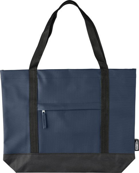 Sac shopping en polyester rPET 600D avec revêtement en PU sur les deux faces pour une meilleure imperméabilité. Il est doté d'une poche frontale zippée, d'une petite poche intérieure zippée et de longues anses. Sa capacité est de 10 litres et sa charge maximale de 10 kg. Il est doté d'une étiquette rPET et d'une étiquette de traçabilité à l'intérieur.