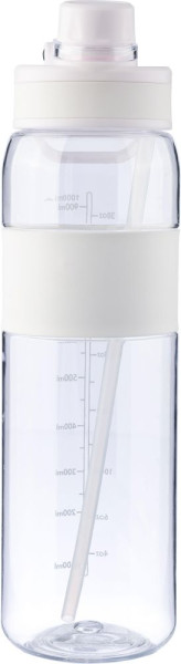 Gourde en Tritan d'une contenance de 900 ml avec deux options d'utilisation : fermeture par vis et paille pliable avec tube interne. Dotée d'une dragonne en silicone, d'une poignée de transport en PP et d'un indicateur de capacité imprimé. Bouchon à vis. Conditionnée dans un carton alvéolé.