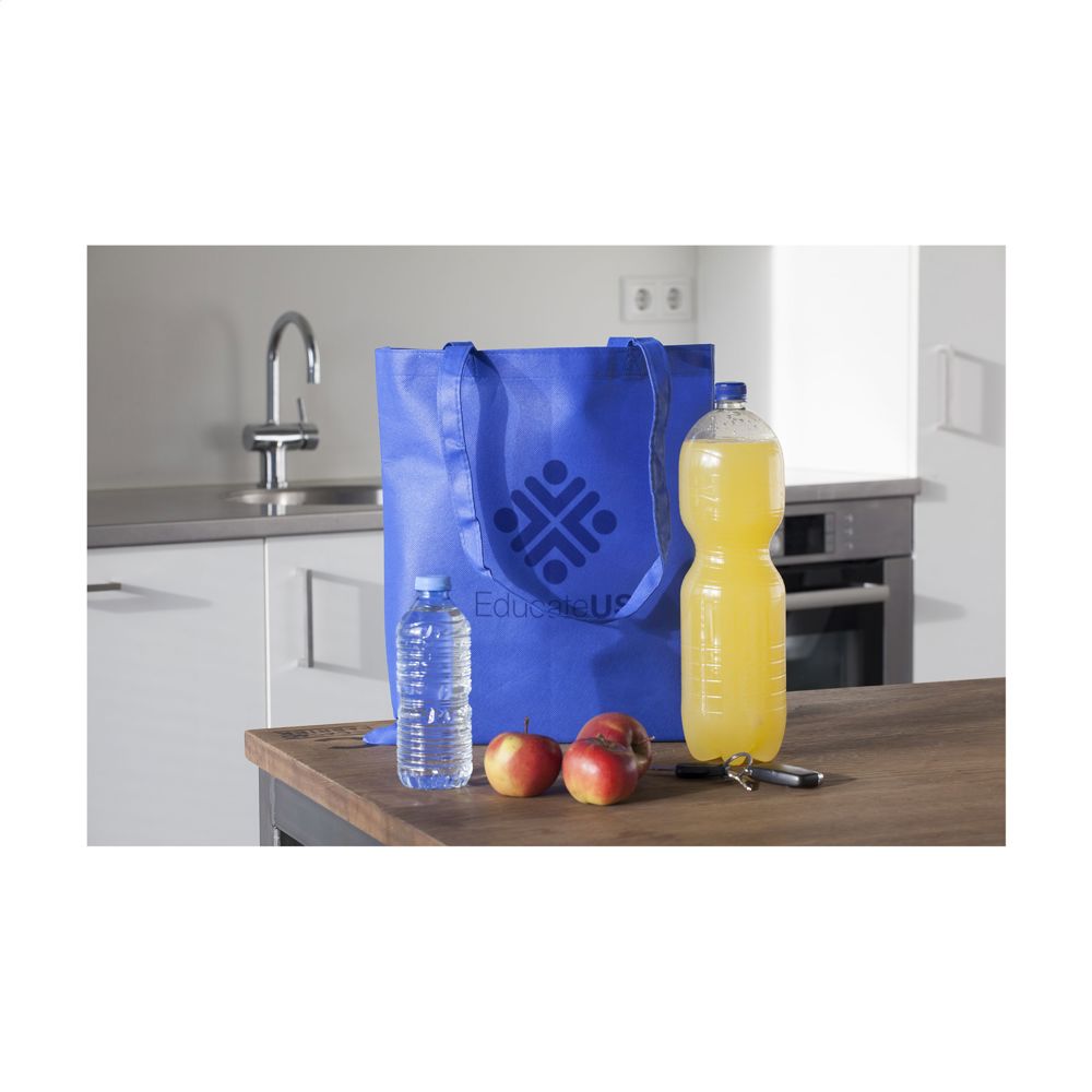 Sac shopping avec de longues anses en non-tissé (80 g/m²) : fibres synthétiques très légères mais solides. Capacité env. 8 litres.