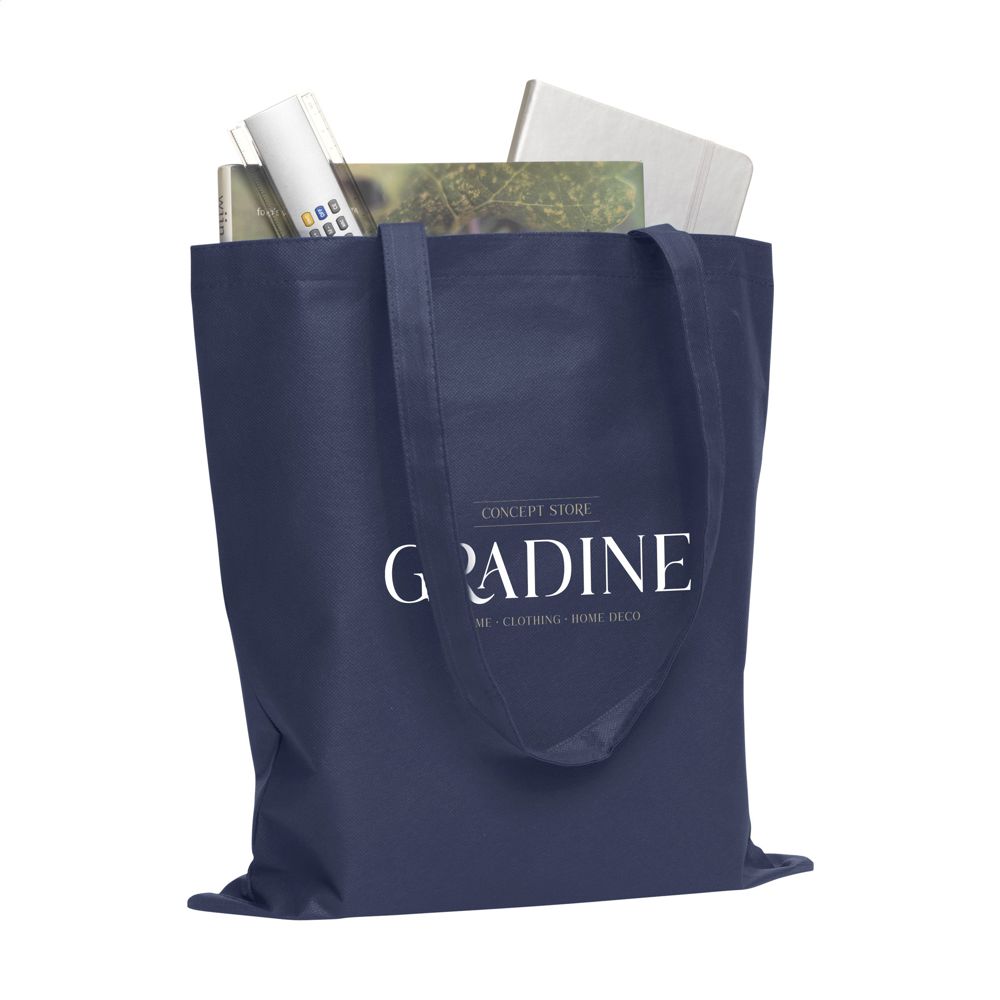 Sac shopping avec de longues anses en non-tissé (80 g/m²) : fibres synthétiques très légères mais solides. Capacité env. 8 litres.