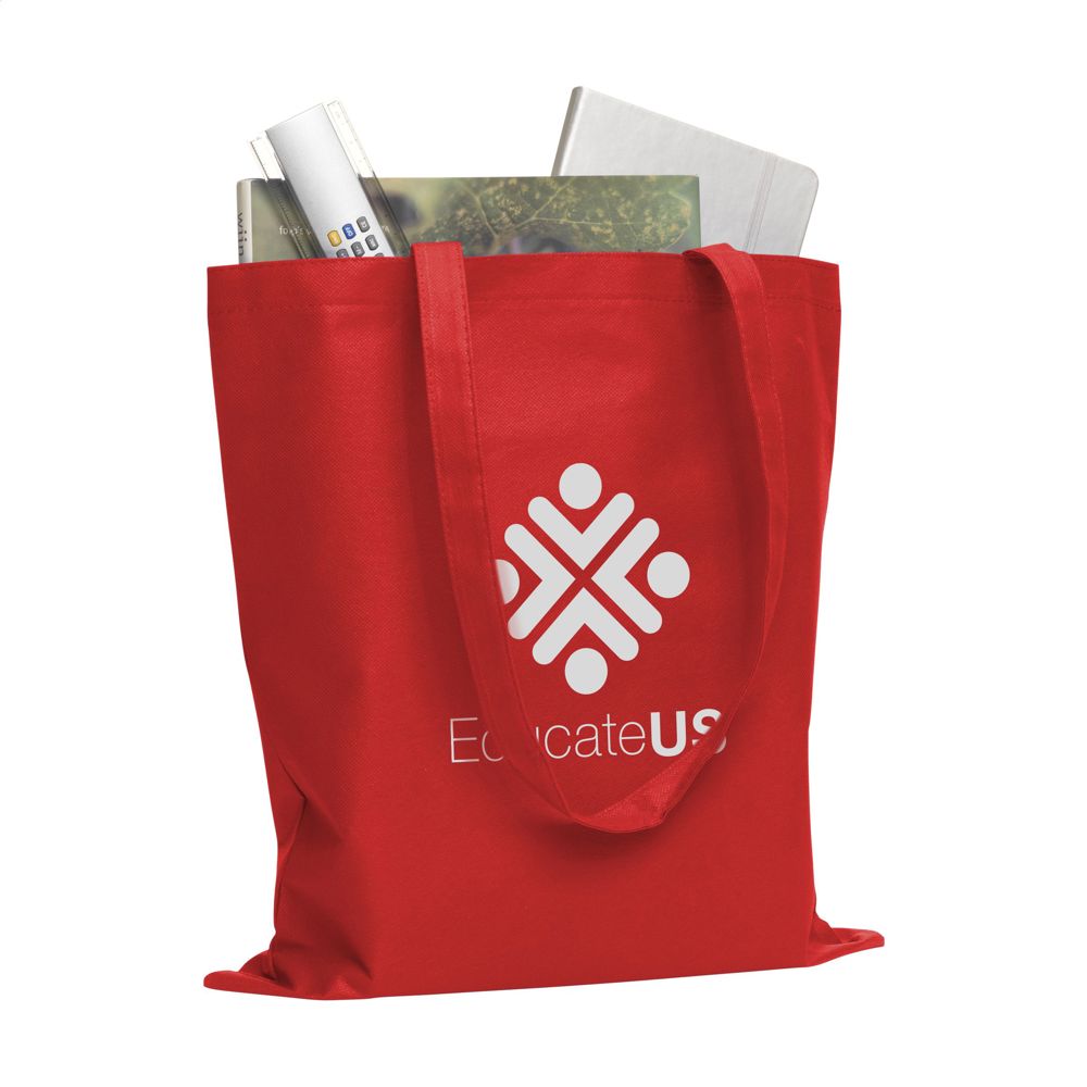 Sac shopping avec de longues anses en non-tissé (80 g/m²) : fibres synthétiques très légères mais solides. Capacité env. 8 litres.