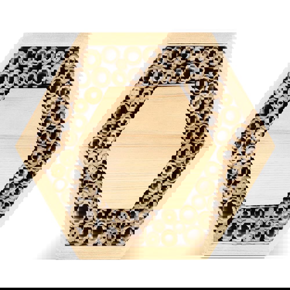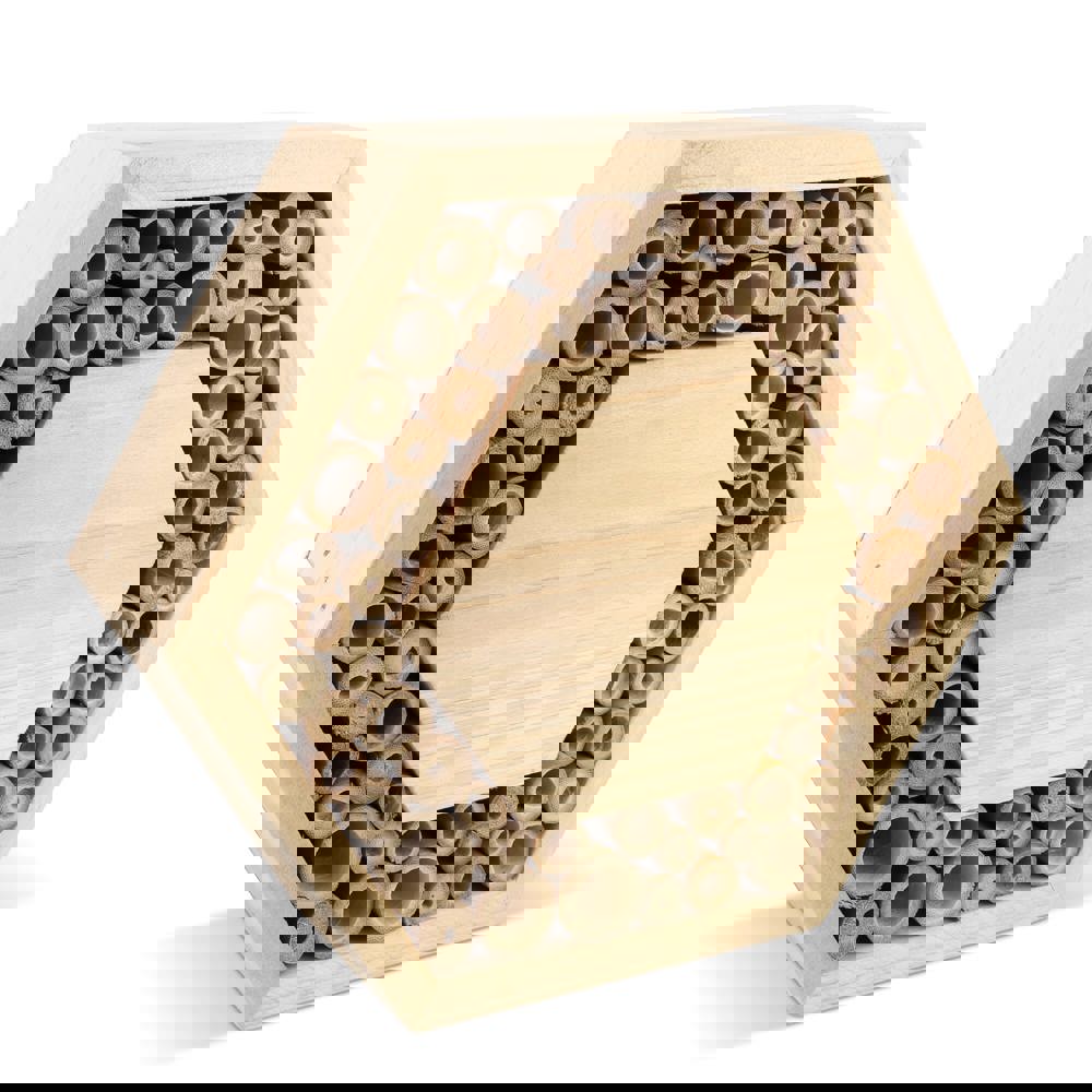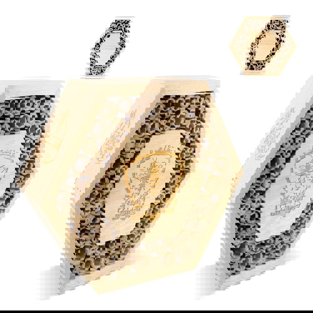Ruche hexagonale en bois FSC avec grande surface centrale pour marquage. Convient aux abeilles solitaires telles que les abeilles maçonnes et les abeilles coupeuses de feuilles. Ces abeilles inoffensives sont des pollinisatrices essentielles qui favorisent la biodiversité dans les jardins et les espaces verts. Un cadeau promotionnel durable et éducatif.