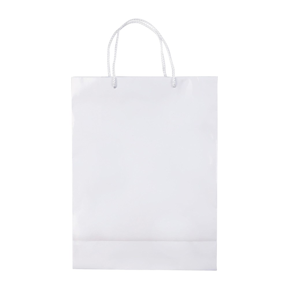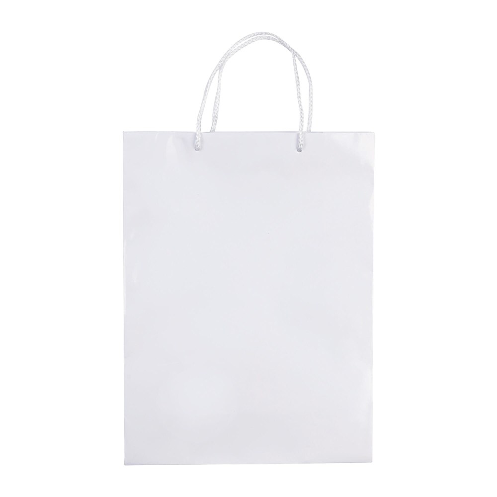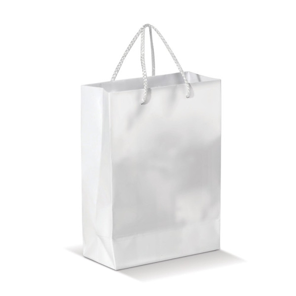 Grand sac papier avec anses tressées en blanc ou noir. Très résistant. Très grandes surfaces de marquage. Impression possible sur les 2 faces. Finition brillante.