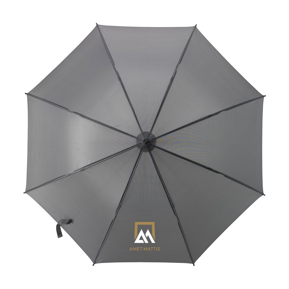 Parapluie avec ouverture automatique. Toile en polyester de 190T, cadre en fibre de verre, manche en métal, poignée douce et fermeture Velcro.
