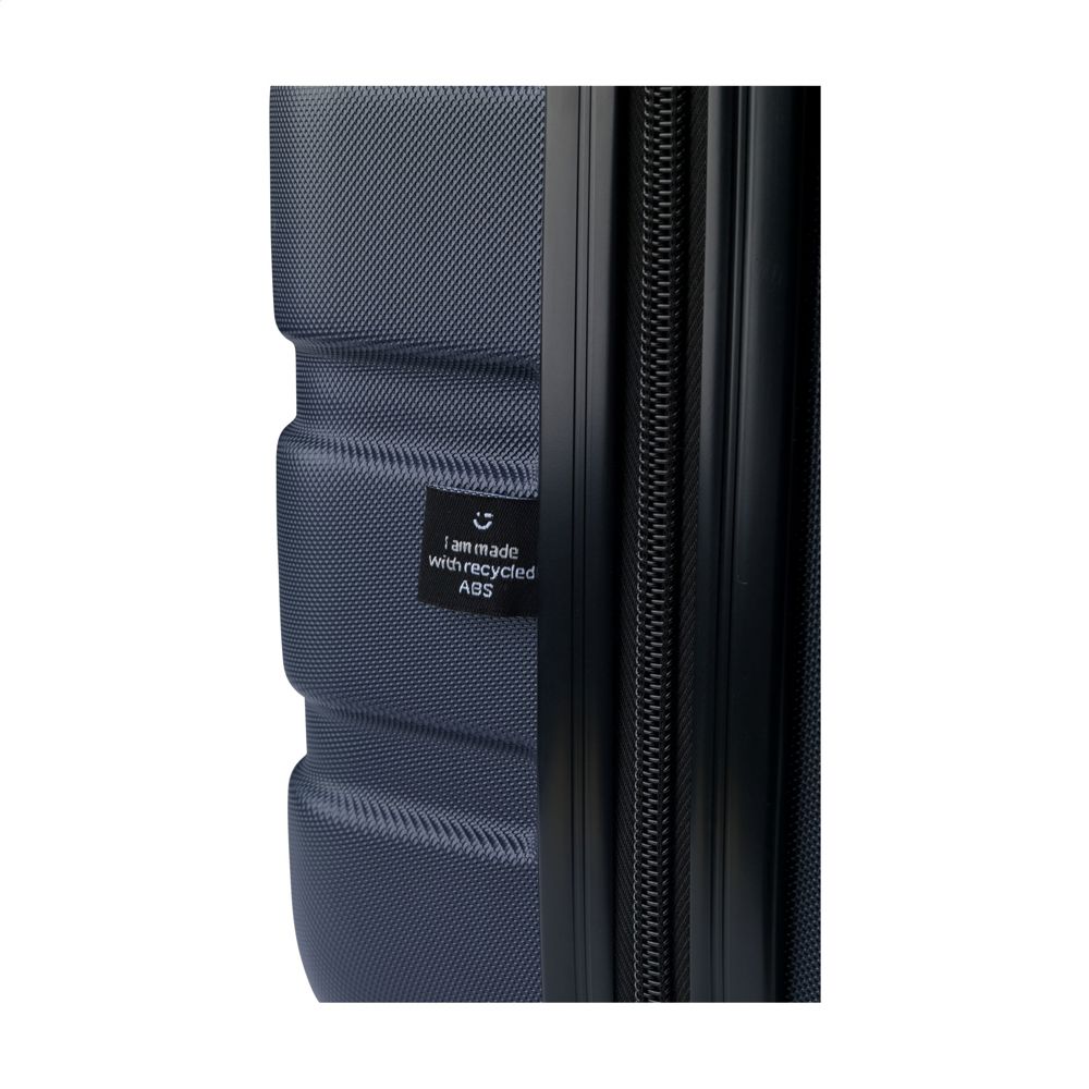 Valise à roulettes légère, fabriqué en ABS 100% certifié GRS recyclé. L'intérieur est doublé de polyester 210D recyclé. Avec un compartiment principal spacieux, 4 roulettes, poignée extensible et serrure à combinaison. Certifié GRS. Matière recyclée totale : 52%. Capacité env. 30 litres.