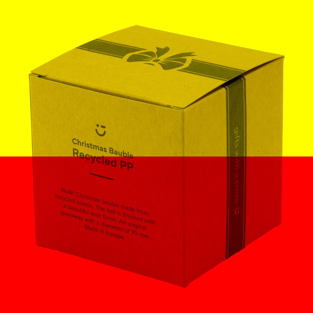 Boule de Noël en plastique recyclé. La boule est dotée d'une belle finition mate. Un cadeau original d'un diamètre de 70 mm. Fabriquée en Europe. Emballage par pièce.