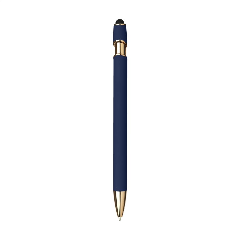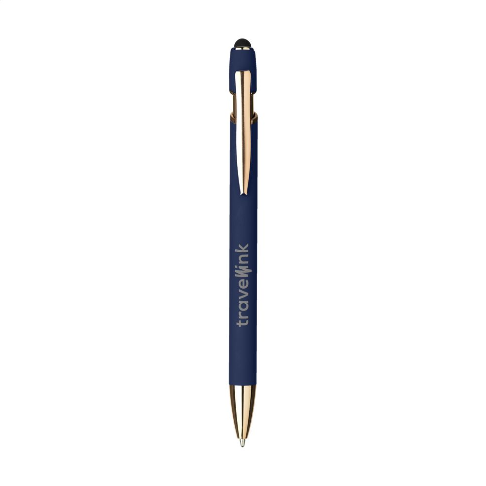Stylo à bille à encre bleue avec corps en aluminium recyclé et alliage de cuivre. Les accents rose doré confèrent au stylo un look chic. Le corps est doté d'une finition caoutchoutée douce au toucher et d'un embout en caoutchouc pour utiliser les écrans tactiles. Avec clip en métal. Certifié RCS. Matière recyclée totale: 94%. Fabriquée en Europe. L'utilisation d'aluminium recyclé permet de réduire le nombre de nouvelles matières premières utilisées pour la fabrication de ce produit. Cela signifie moins de consommation d'énergie et moins d'utilisation d'eau.