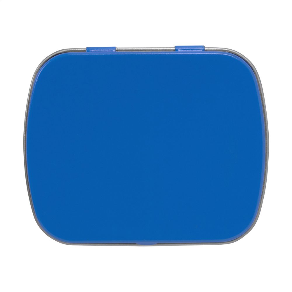Boîte de bonbons en métal mat remplie avec environ 25 g de pastilles à la menthe.