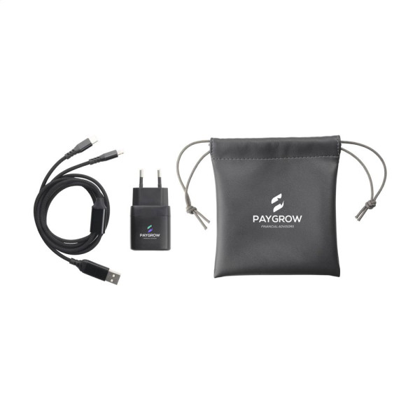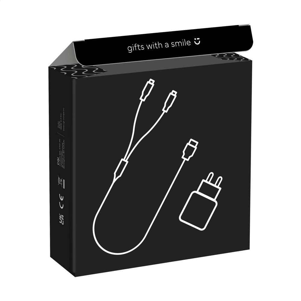 Ensemble de chargement : chargeur mural en PC recyclé. Avec 2 ports Type-C et un câble de chargement. Le câble est fabriqué en TPE recyclé, PET recyclé et alliage d'aluminium recyclé. Longueur du câble : 120 cm. Entrée : Type-C et connecteur USB-A. Sortie : Type-C et Lightning. Par set dans une pochette en PU recyclé. Idéal comme set de voyage. Certifié RCS. Matière recyclée totale : 45%. Emballage par pièce.