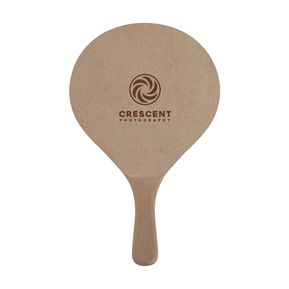 Ensemble de plage sportif : 2 raquettes en MDF brut et balle en caoutchouc. Chaque ensemble est livré dans un filet de rangement en maille de coton. REMARQUE : Pour une impression en 2 couleurs sur les raquettes, aucun alignement parfait des couleurs ne peut être garanti - cela n’est possible que si les couleurs ne se touchent pas.