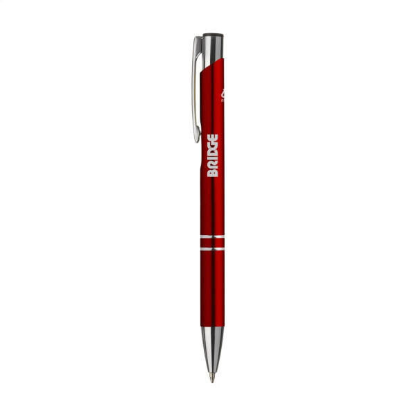 Stylo à bille à encre bleue en aluminium recyclé. Le corps a une belle finition brillante d'aspect métallique et est fourni avec un clip en métal. L'utilisation d'aluminium recyclé permet de réduire le nombre de nouvelles matières premières utilisées pour la fabrication de ce produit. Cela signifie moins de consommation d'énergie et moins d'utilisation d'eau.