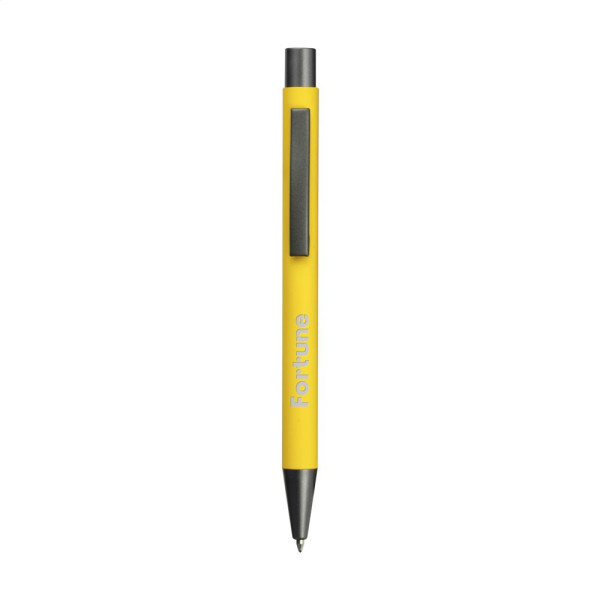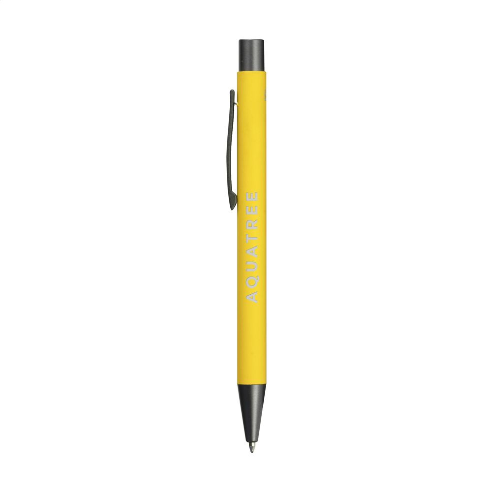 Stylo à bille à encre bleue en aluminium recyclé. Ce stylo a un corps fini avec un beau revêtement caoutchouté, un clip en métal robuste, une pointe en plastique et un bouton-poussoir. L'utilisation d'aluminium recyclé permet de réduire le nombre de nouvelles matières premières utilisées pour la fabrication de ce produit. Cela signifie moins de consommation d'énergie et moins d'utilisation d'eau.