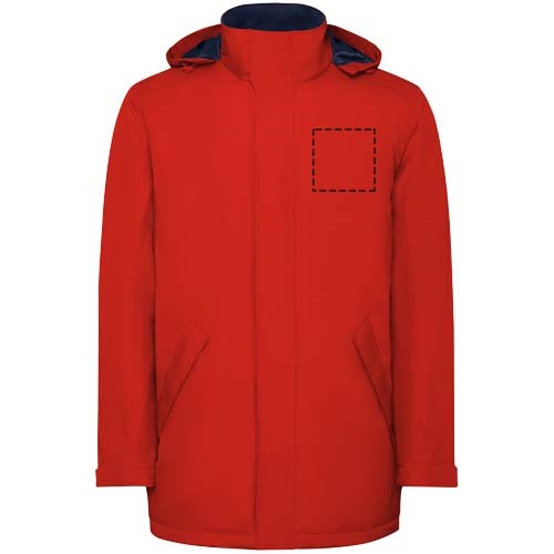 Veste parka matelassée et imperméable pour homme. Col montant avec capuche repliée et amovible avec fermeture auto-agrippante. Fermeture à glissière centrale assortie avec rabat. Poches latérales avec fermeture à glissière et rabat fixe. Poche intérieure avec fermeture auto-agrippante. Poignets réglables avec fermeture auto-agrippante. Accès intérieur aux renforts dans le dos et sur la poitrine (côté gauche).