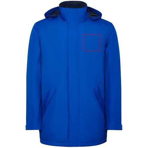 Veste parka matelassée et imperméable pour homme. Col montant avec capuche repliée et amovible avec fermeture auto-agrippante. Fermeture à glissière centrale assortie avec rabat. Poches latérales avec fermeture à glissière et rabat fixe. Poche intérieure avec fermeture auto-agrippante. Poignets réglables avec fermeture auto-agrippante. Accès intérieur aux renforts dans le dos et sur la poitrine (côté gauche).